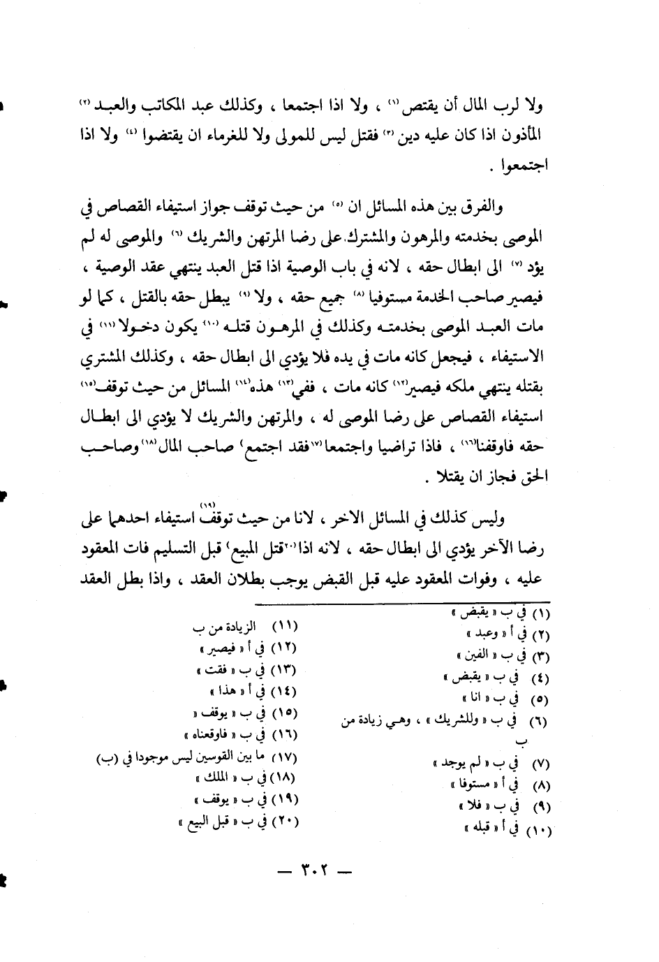 وَالْفَرْقُ بَيْنَ هَذِهِ الْمَسَائِلِ أَنَّهُ مِنْ حَيْثُ تَوَقَّفَ جَوَازُ اسْتِيفَاءِ الْقِصَاصِ فِي الْمُوصَى بِخِدْمَتِهِ وَالْمَرْهُونِ وَالْمُشْتَرَكِ عَلَى رِضَا الْمُرْتَهِنِ وَالشَّرِيكِ وَالْمُوصَى لَهُ لَمْ يُؤَدِّ إلَى إبْطَالِ حَقِّهِ؛ لِأَنَّهُ فِي بَابِ الْوَصِيَّةِ إذَا قُتِلَ الْعَبْدُ يَنْتَهِي عَقْدُ الْوَصِيَّةِ، فَيَصِيرُ صَاحِبُ الْخِدْمَةِ مُسْتَوْفِيًا جَمِيعَ حَقِّهِ، وَلَا يَبْطُلُ حَقُّهُ بِالْقَتْلِ، كَمَا لَوْ مَاتَ الْعَبْدُ الْمُوصَى بِخِدْمَتِهِ وَكَذَلِكَ فِي الْمَرْهُونِ قَتْلُهُ يَكُونُ دُخُولًا فِي الِاسْتِيفَاءِ، فَيُجْعَلُ كَأَنَّهُ مَاتَ فِي يَدِهِ فَلَا يُؤَدِّي إلَى إبْطَالِ حَقِّهِ، وَكَذَلِكَ الْمُشْتَرِي بِقَتْلِهِ يَنْتَهِي مِلْكُهُ فَيَصِيرُ كَأَنَّهُ مَاتَ، فَفِي هَذِهِ الْمَسَائِلِ مِنْ حَيْثُ تَوَقَّفَ اسْتِيفَاءُ الْقِصَاصِ عَلَى رِضَا الْمُوصَى لَهُ، وَالْمُرْتَهِنِ وَالشَّرِيكِ لَا يُؤَدِّي إلَى إبْطَالِ حَقِّهِ فَأَوْقَفْنَا، فَإِذَا تَرَاضَيَا وَاجْتَمَعَا فَقَدْ اجْتَمَعَ صَاحِبُ الْمَالِ وَصَاحِبُ الْحَقِّ فَجَازَ أَنْ يَقْتُلَا.