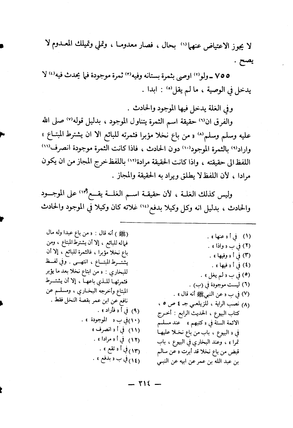 755 - وَلَوْ أَوْصَى بِثَمَرَةِ بُسْتَانِهِ وَفِيهِ ثَمَرَةٌ مَوْجُودَةٌ فَمَا يَحْدُثُ فِيهِ لَا يَدْخُلُ فِي الْوَصِيَّةِ، مَا لَمْ يَقُلْ: أَبَدًا.