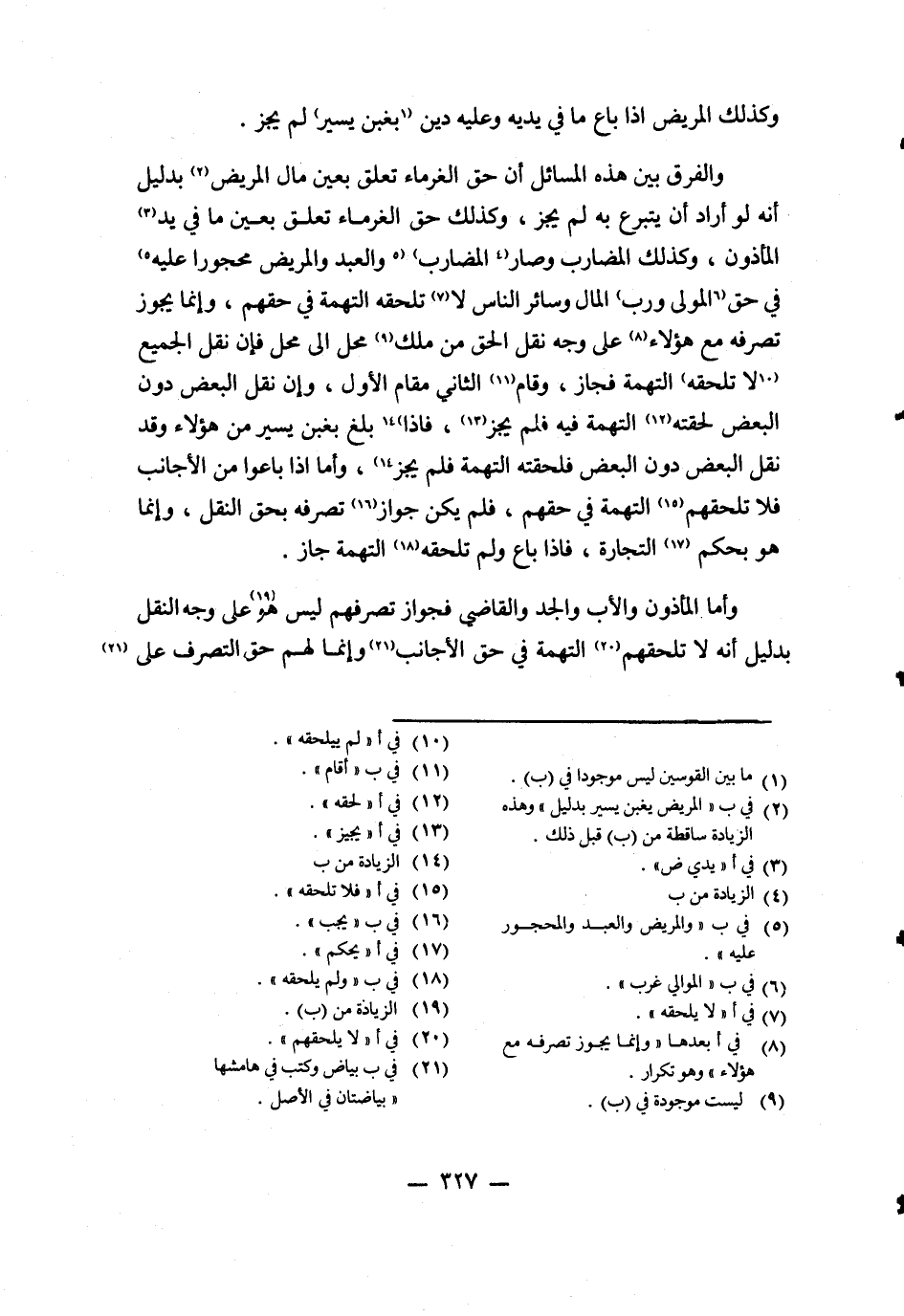 وَالْفَرْقُ بَيْنَ هَذِهِ الْمَسَائِلِ أَنَّ حَقَّ الْغُرَمَاءِ تَعَلَّقَ بِعَيْنِ مَالِ الْمَرِيضِ بِدَلِيلِ أَنَّهُ لَوْ أَرَادَ أَنْ يَتَبَرَّعَ بِهِ لَمْ يَجُزْ، وَكَذَلِكَ حَقُّ الْغُرَمَاءِ تَعَلَّقَ بِعَيْنِ مَا فِي يَدِ الْمَأْذُونِ، وَكَذَلِكَ الْمُضَارِبُ وَصَارَ الْمُضَارِبُ وَالْعَبْدُ وَالْمَرِيضُ مَحْجُورًا عَلَيْهِ فِي حَقِّ الْمَوْلَى وَرَبِّ الْمَالِ وَسَائِرِ النَّاسِ لَا تَلْحَقُهُ التُّهْمَةُ فِي حَقِّهِمْ، وَإِنَّمَا يَجُوزُ تَصَرُّفُهُ مَعَ هَؤُلَاءِ عَلَى وَجْهِ نَقْلِ الْحَقِّ مِنْ مِلْكِ مَحَلٍّ إلَى مَحَلٍّ فَإِنْ نَقَلَ الْجَمِيعَ لَا تَلْحَقُهُ التُّهْمَةُ فَجَازَ، وَقَامَ الثَّانِي مَقَامَ الْأَوَّلِ، وَإِنْ نَقَلَ الْبَعْضَ دُونَ الْبَعْضِ لَحِقَتْهُ التُّهْمَةُ فِيهِ فَلَمْ يَجُزْ، فَإِذَا بَلَغَ بِغَبْنٍ يَسِيرٍ مِنْ هَؤُلَاءِ وَقَدْ نَقَلَ الْبَعْضَ دُونَ الْبَعْضِ فَلَحِقَتْهُ التُّهْمَةُ فَلَمْ يَجُزْ، وَأَمَّا إذَا بَاعُوا مِنْ الْأَجَانِبِ فَلَا تَلْحَقُهُمْ التُّهْمَةُ فِي حَقِّهِمْ، فَلَمْ يَكُنْ جَوَازُ تَصَرُّفِهِ بِحَقِّ النَّقْلِ، وَإِنَّمَا هُوَ بِحُكْمِ التِّجَارَةِ، فَإِذَا بَاعَ وَلَمْ تَلْحَقْهُ التُّهْمَةُ جَازَ.