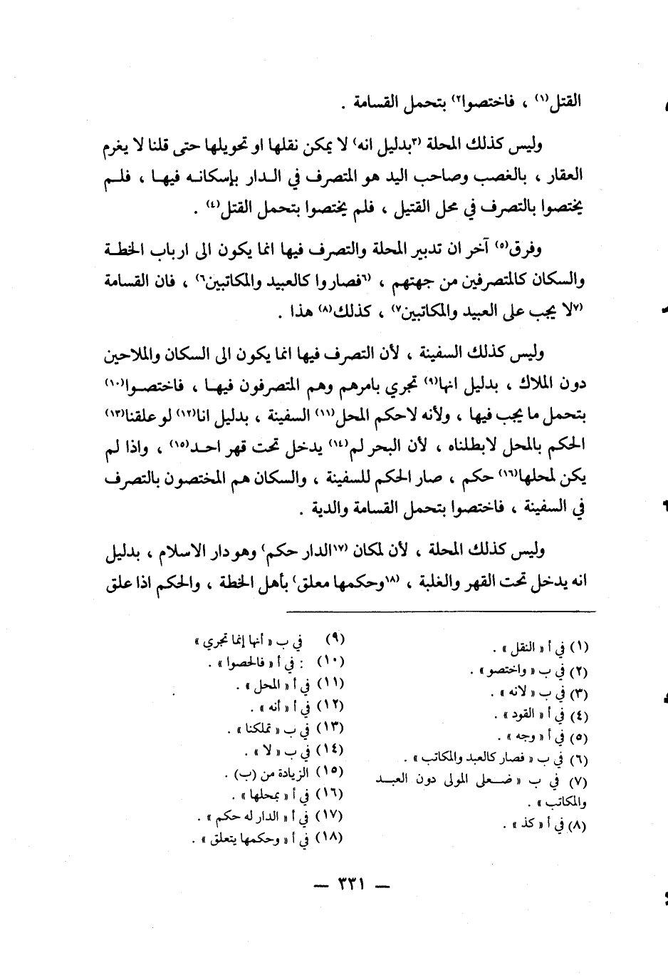 وَلَيْسَ كَذَلِكَ السَّفِينَةُ، لِأَنَّ التَّصَرُّفَ فِيهَا إنَّمَا يَكُونُ إلَى السُّكَّانِ وَالْمَلَّاحِينَ دُونَ الْمُلَّاكِ، بِدَلِيلِ أَنَّهَا تَجْرِي بِأَمْرِهِمْ وَهُمْ الْمُتَصَرِّفُونَ فِيهَا، فَاخْتُصُّوا بِتَحَمُّلِ مَا يَجِبُ فِيهَا، وَلِأَنَّهُ لَا حُكْمَ لِمَحَلِّ السَّفِينَةِ، بِدَلِيلِ أَنَّا لَوْ عَلَّقْنَا الْحُكْمَ بِالْمَحَلِّ لَأَبْطَلْنَاهُ، لِأَنَّ الْبَحْرَ لَمْ يَدْخُلْ تَحْتَ قَهْرِ أَحَدٍ، وَإِذَا لَمْ يَكُنْ لِمَحَلِّهَا حُكْمٌ، صَارَ الْحُكْمُ لِلسَّفِينَةِ، وَالسُّكَّانُ هُمْ الْمُخْتَصُّونَ بِالتَّصَرُّفِ فِي السَّفِينَةِ، فَاخْتُصُّوا بِتَحَمُّلِ الْقَسَامَةِ وَالدِّيَةِ.