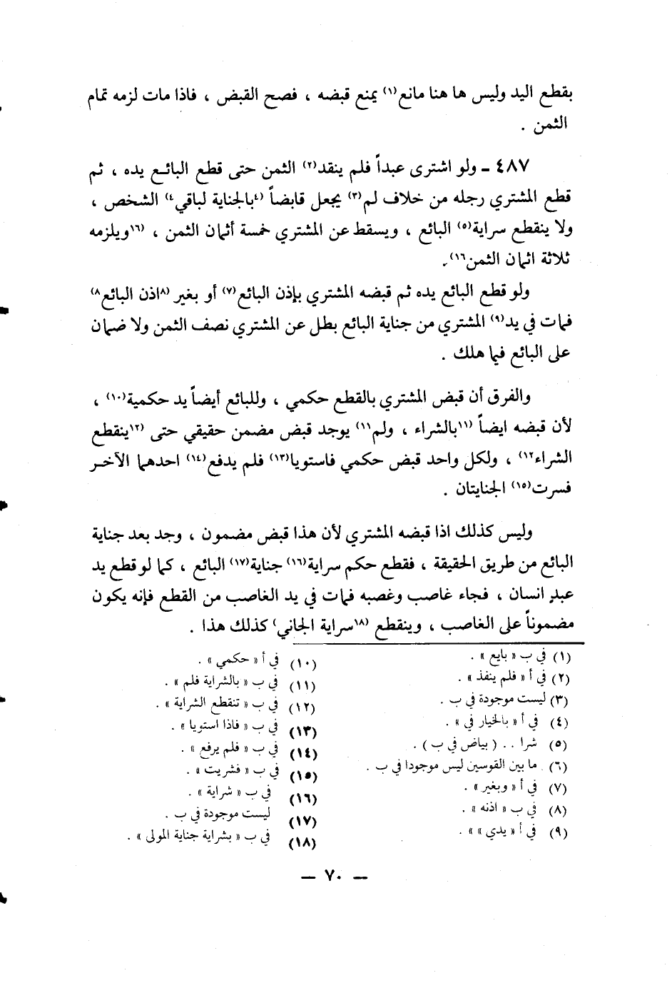 487 - وَلَوْ اشْتَرَى عَبْدًا فَلَمْ يَنْقُدْ الثَّمَنَ حَتَّى قَطَعَ الْبَائِعُ يَدَهُ، ثُمَّ قَطَعَ الْمُشْتَرِي رِجْلَهُ مِنْ خِلَافٍ لَمْ يُجْعَلْ قَابِضًا بِالْجِنَايَةِ لِبَاقِي الشَّخْصِ، وَلَا يَنْقَطِعُ سِرَايَةُ الْبَائِعِ، وَيَسْقُطُ عَنْ الْمُشْتَرِي خَمْسَةُ أَثْمَانِ الثَّمَنِ، وَيَلْزَمُهُ ثَلَاثَةُ أَثْمَانِ الثَّمَنِ.