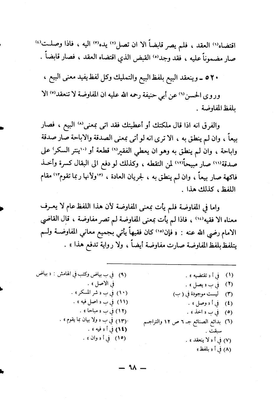 520 - وَيَنْعَقِدُ الْبَيْعُ بِلَفْظِ الْبَيْعِ وَالتَّمْلِيكِ وَكُلِّ لَفْظٍ يُفِيدُ مَعْنَى الْبَيْعِ، وَرَوَى الْحَسَنُ عَنْ أَبِي حَنِيفَةَ رَحْمَةُ اللَّهِ عَلَيْهِ أَنَّ الْمُفَاوَضَةَ لَا تَنْعَقِدُ إلَّا بِلَفْظِ الْمُفَاوَضَةِ.