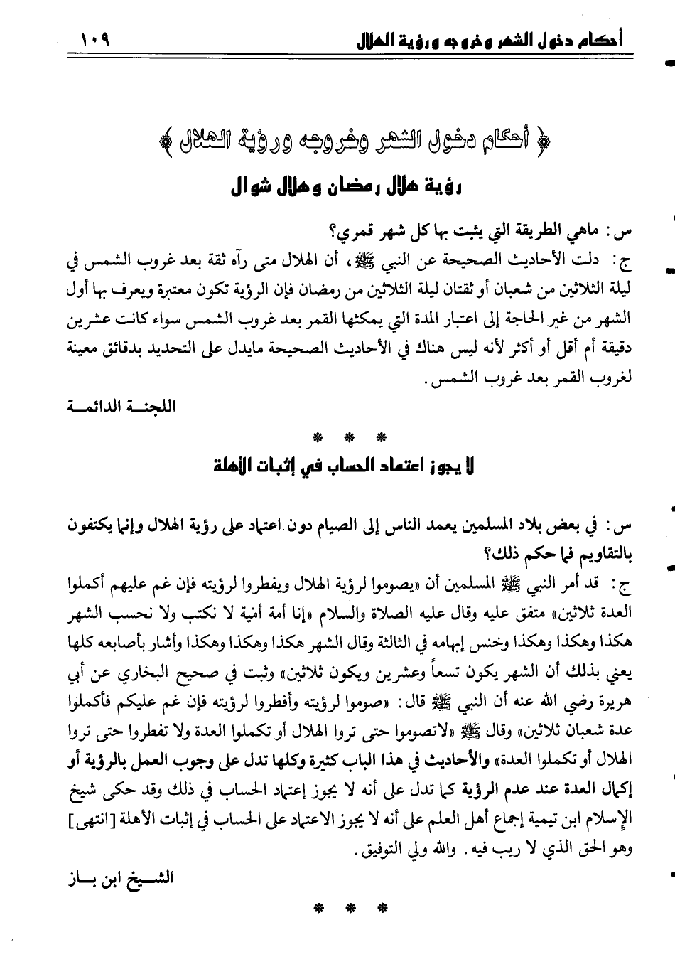 ج قد أمر النبي صلى الله عليه وسلم المسلمين أن ((يصوموا لرؤية الهلال ويفطروا لرؤيته فإن غم عليهم أكملوا العدة ثلاثين)) متفق عليه وقال عليه الصلاة والسلام ((إنا أمة أمية لا نكتب ولا نحسب الشهر هكذا وهكذا وهكذا وخنس إبهامه في الثالثة وقال الشهر هكذا وهكذا وهكذا وأشار بأصابعه كلها يعني بذلك أن الشهر يكون تسعاً وعشرين ويكون ثلاثين) وثبت في صحيح البخاري عن أبي هريرة رضي الله عنه أن النبي صلى الله عليه وسلم قال ((صوموا لرؤيته وأفطروا لرؤيته فإن غم عليكم فأكملوا عدة شعبان ثلاثين)) وقال صلى الله عليه وسلم ((لا تصوموا حتى تروا الهلال أو تكملوا العدة ولا تفطروا حتى تروا الهلال أو تكملوا العدة)) والأحاديث في هذا الباب كثيرة وكلها تدل على وجوب العمل بالرؤية أو إكمال العدة عند عدم الرؤية كما تدل على أنه لا يجوز إعتماد الحساب في ذلك وقد حكى شيخ الإسلام ابن تيمية إجماع أهل العلم على أنه لا يجوز الاعتماد على الحساب في إثبات الأهلة] انتهى [وهو الحق الذي لا ريب فيه. والله ولي التوفيق.