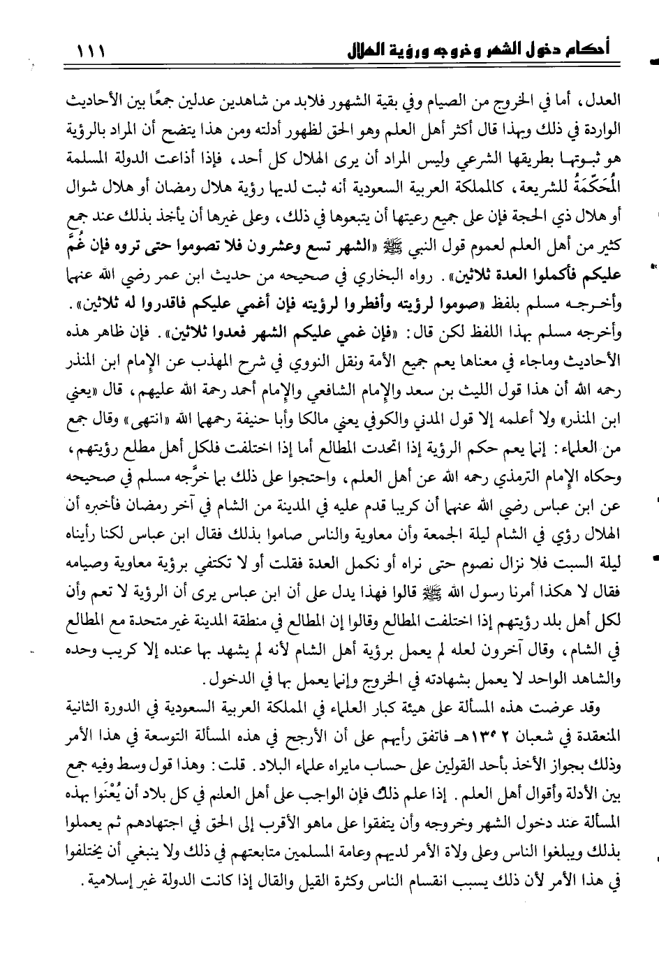 العدل، أما في الخروج من الصيام وفي بقية الشهور فلا بد من شاهدين عدلين جمعاً بين الأحاديث الواردة في ذلك وبهذا قال أكثر أهل العلم وهو الحق لظهور أدلته ومن هذا يتضح أن المراد بالرؤية هو ثبوتها بطريقها الشرعي وليس المراد أن يرى الهلال كل أحد، فإذا أذاعت الدولة المسلمة الُمحَكّمَةُ للشريعة، كالمملكة العربية السعودية أنه ثبت لديها رؤية هلال رمضان أو هلال شوال أو هلال ذي الحجة فإن على جميع رعيتها أن يتبعوها في ذلك، وعلى غيرها أن يأخذ بذلك عند جمع كثير من أهل العلم لعموم قول النبي صلى الله عليه وسلم ((الشهر تسع وعشرون فلا تصوموا حتى تروه فإن غُمَّ عليكم فأكملوا العدة ثلاثين)) . رواه البخاري في صحيحة من حديث ابن عمر رضي الله عنهما وأخرجه مسلم بلفظ ((صوموا لرؤيته وأفطروا لرؤيته فإن أغمي عليكم فاقدروا له ثلاثين)) .
