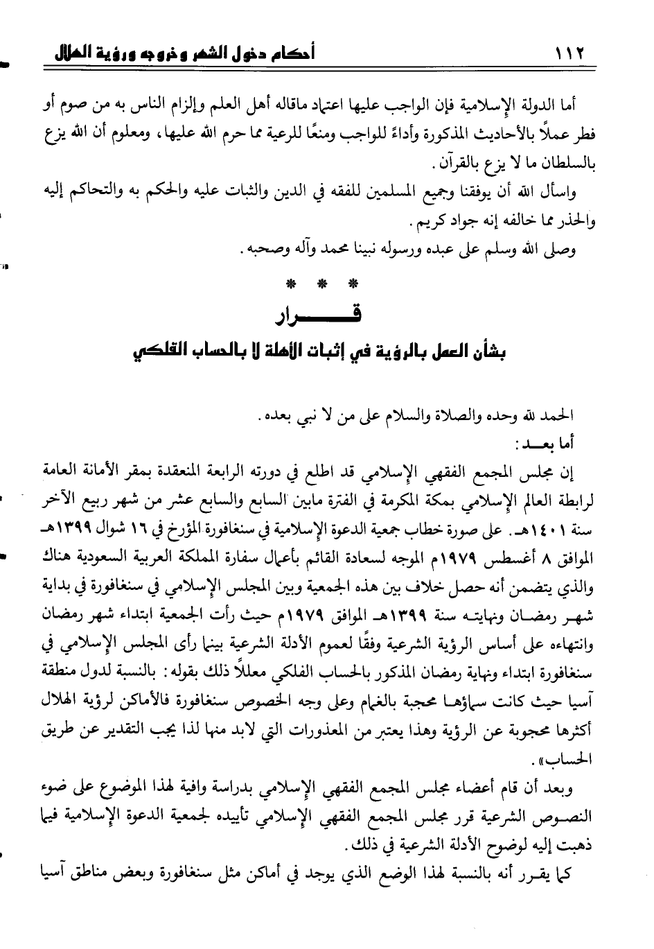 إن مجلس المجمع الفقهي الإسلامي قد اطلع في دورته الرابعة المنعقدة بمقر الأمانة العامة لرابطة العالم الإسلامي بمكة المكرمة في الفترة ما بين السابع والسابع عشر من شهر ربيع الآخر سنة 1401هـ. على صورة خطاب جمعية الدعوة الإسلامية في سنغافورة المؤرخ في 16شوال 1399هـ الموافق 8 أغسطس 1979م الموجه لسعادة القائم بأعمال سفارة المملكة العربية السعودية هناك والذي يتضمن أنه حصل خلاف بين هذه الجمعية وبين المجلس الإسلامي في سنغافورة في بداية شهر رمضان ونهايته سنة 1399هـ الموافق 1979م حيث رأت الجمعية ابتداء شهر رمضان وانتهاءه على أساس الرؤية الشرعية وفقاً لعموم الأدلة الشرعية بينما رأى المجلس الإسلامي في سنغافورة ابتداء ونهاية رمضان المذكور بالحساب الفلكي معللاً ذلك بقوله بالنسبة لدول منطقة آسيا حيث كانت سماؤها محجبة بالغمام وعلى وجه الخصوص سنغافورة فالأماكن لرؤية الهلال أكثرها محجوبة عن الرؤية وهذا يعتبر من المعذورات التي لا بد منها لذا يجب التقدير عن طريق الحساب)) .