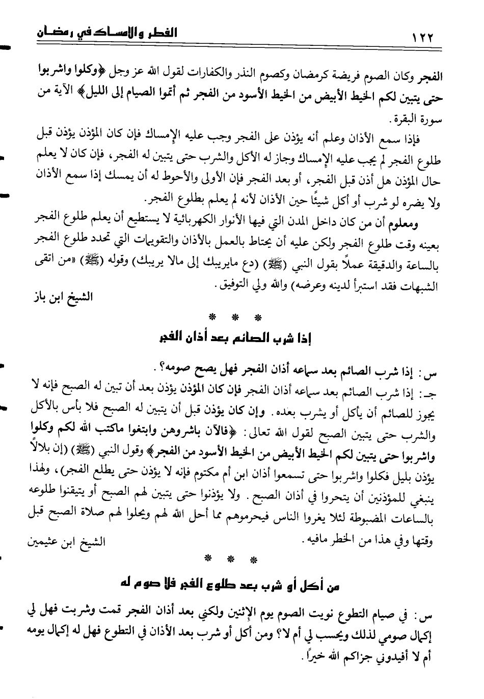 ومعلوم أن من كان داخل المدن التي فيها الأنوار الكهربائية لا يستطيع أن يعلم طلوع الفجر بعينه وقت طلوع الفجر ولكن عليه أن يحتاط بالعمل بالأذان والتقويمان التي يحدد طلوع الفجر بالساعة والدقيقة عملاً بقول النبي (صلى الله عليه وسلم) (دع ما يريبك إلى مالا يريبك) وقوله (صلى الله عليه وسلم) ((من اتقى الشبهات فقد استبرأ لدينه وعرضه) والله ولي التوفيق.