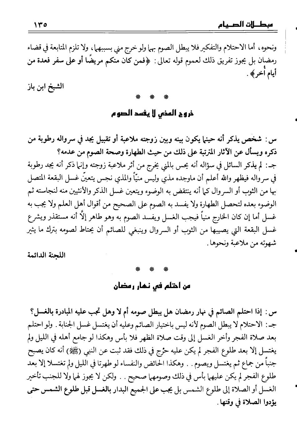 ج الاحتلام لا يبطل الصوم لأنه ليس باختيار الصائم وعليه أن يغتسل غسل الجنابة. ولو احتلم بعد صلاة الفجر وأخر الغسل إلى وقت صلاة الظهر فلا بأس وهكذا لو جامع أهله في الليل ولم يغتسل إلا بعد طلوع الفجر لم يكن عليه حرج في ذلك فقد ثبت عن النبي (صلى الله عليه وسلم) أنه كان يصبح جنباً من جماع ثم يغتسل ويصوم. . وهكذا الحائض والنفساء لو طهرتا في الليل ولم تغتسلا إلا بعد الغسل أو الصلاة إلى طلوع الشمس بل يجب على الجميع البدار بالغسل قبل طلوع الشمس حتى يؤدوا الصلاة في وقتها.