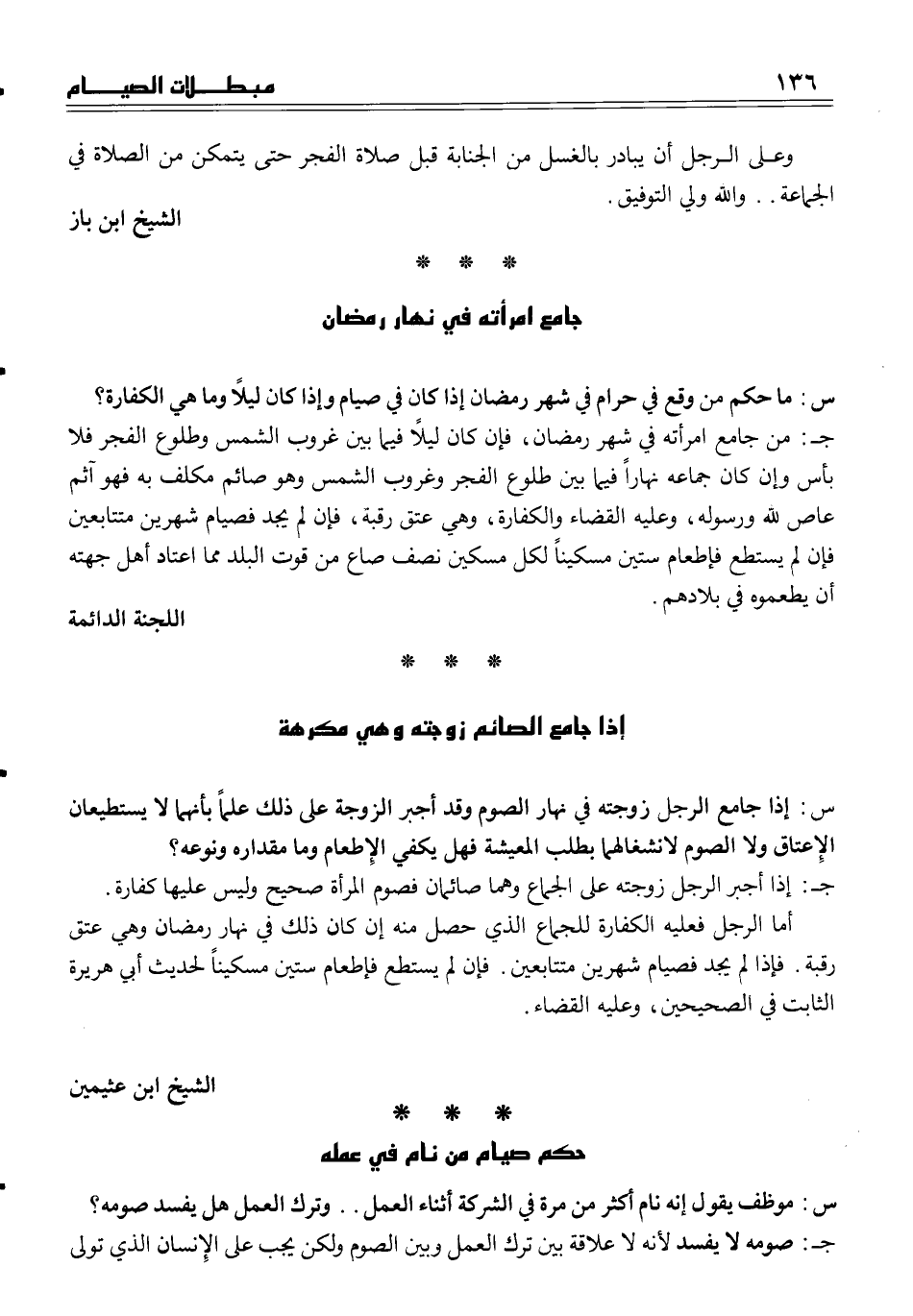 ج من جامع امرأته في شهر رمضان، فإن كان ليلاً فيما بين غروب الشمس وطلوع الفجر فلا بأس وإن كان جماعه نهاراً فيما بين طلوع الفجر وغروب الشمس وهو صائم مكلف به فهو آثم عاص لله ورسوله، وعليه القضاء والكفارة، وهي عتق رقبة، فإن لم يجد فصيام شهرين متتابعين فإن لم يستطع فإطعام ستين مسكيناً لكل مسكين نصف صاع من قوت البلد مما اعتاد أهل جهته أن يطعموه في بلادهم.