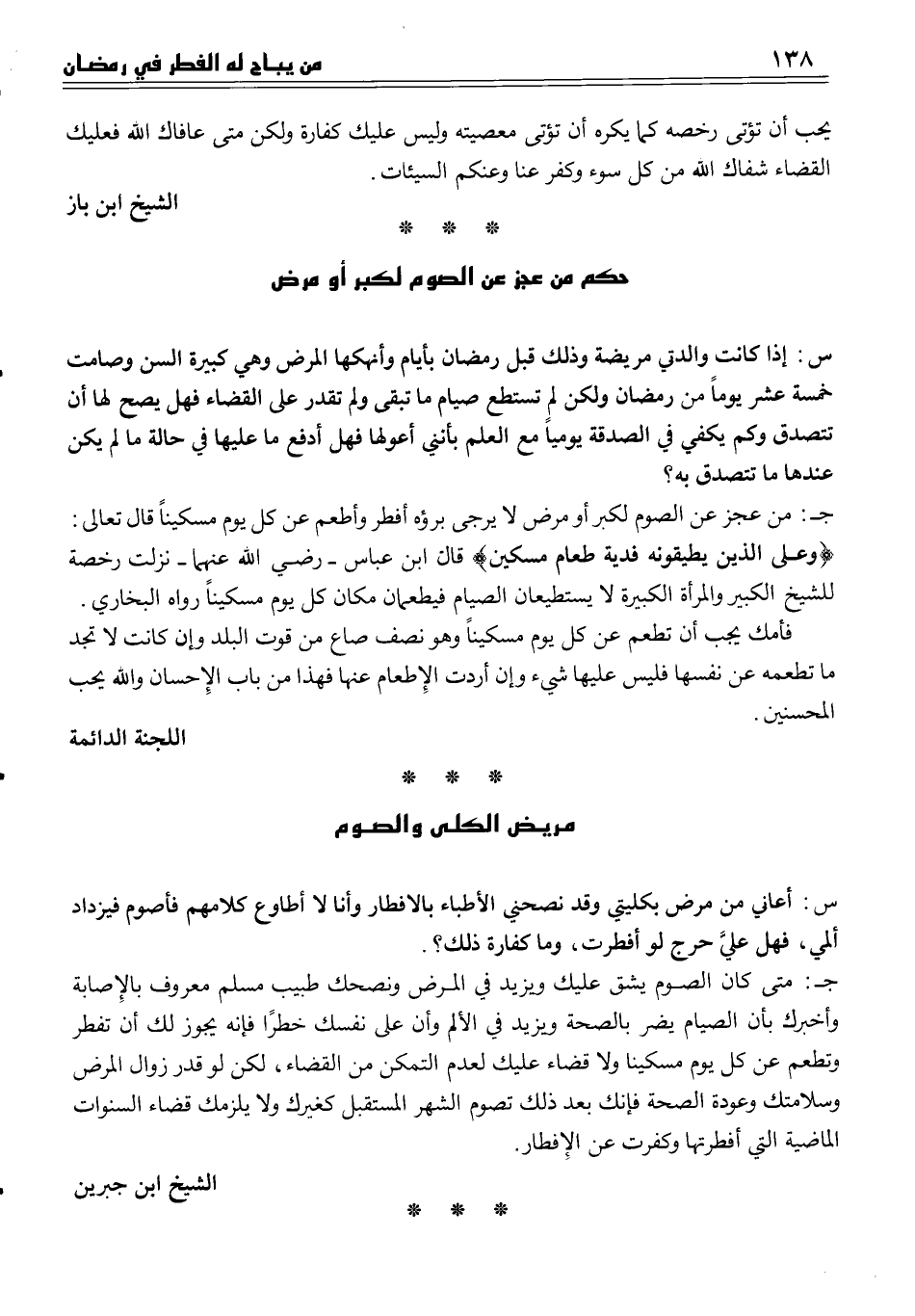ج من عجز عن الصوم لكبر أو مرض لا يرجى برؤه أفطر وأطعم عن كل يوم مسكيناً قال تعالى (وعلى الذين يطيقونه فدية طعام مسكين) قال ابن عباس ـ رضي الله عنهما ـ نزلت رخصة للشيخ الكبير والمرأة الكبيرة لا يستطيعان الصيام فيطعمان مكان كل يوم مسكيناً رواه البخاري.