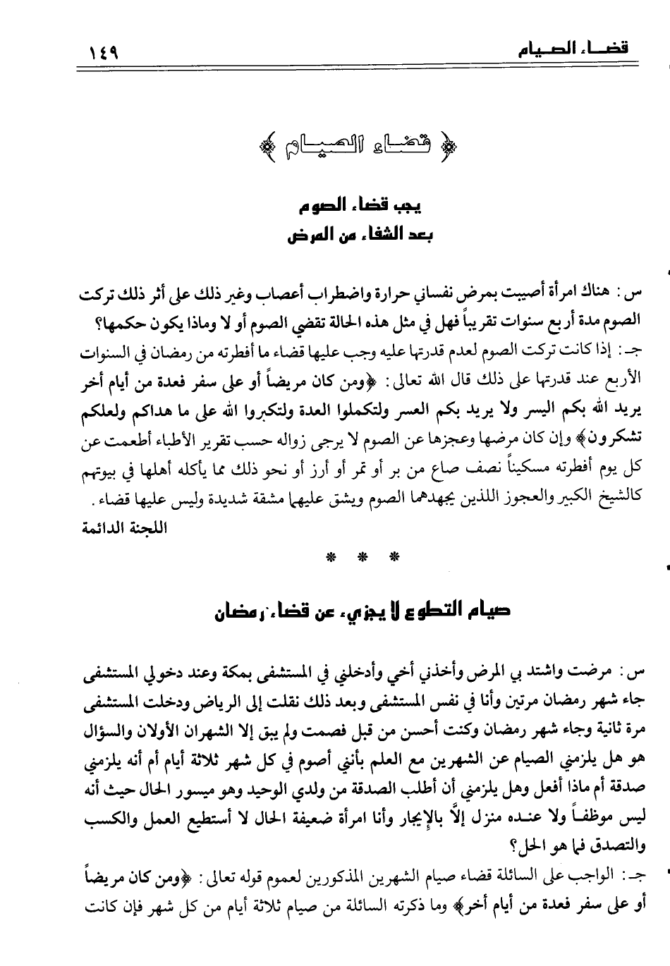 ج إذا كانت تركت الصوم لعدم قدرتها عليه وجب عليها قضاء ما أفطرته من رمضان في السنوات الأربع عند قدرتها على ذلك قال الله تعالى (ومن كان مريضاً أو على سفر فعدة من أيام أخر يريد الله بكم اليسر ولا يريد بكم العسر ولتكملوا العدة ولتكبروا الله على ما هداكم ولعلكم تشكرون) وإن كان مرضها وعجزها عن الصوم لا يرجى زواله حسب تقرير الأطباء أطعمت عن كل يوم أفطرته مسكيناً نصف صاع من بر أو تمر أو أرز أو نحو ذلك مما يأكله أهلها في بيوتهم كالشيخ الكبير والعجوز اللذين يجهدهما الصوم ويشق عليهما مشقة شديدة وليس عليها قضاء.