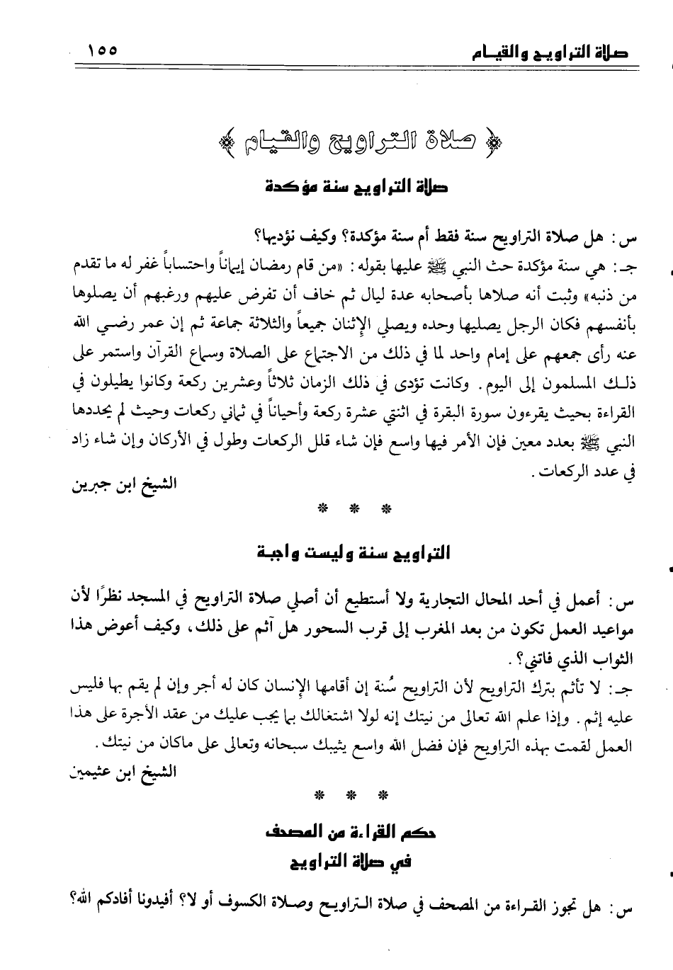ج هي سنة مؤكدة حث النبي صلى الله عليه وسلم عليها بقوله ((من قام رمضان إيماناً واحتساباً غفر له ما تقدم من ذنبه)) وثبت أنه صلاها بأصحابه عدة ليال ثم خاف أن تفرض عليهم ورغبهم أن يصلوها بأنفسهم فكان الرجل يصليها وحده ويصلي الإثنان جميعاً والثلاثة جماعة ثم أن عمر رضي الله عنه رأى جمعهم على إمام واحد لما في ذلك من الاجتماع على الصلاة وسماع القرآن واستمر على ذلك المسلمون إلى اليوم. وكانت تؤدى في ذلك الزمان ثلاثاً وعشرين ركعة وكانوا يطيلون في القراءة بحيث يقرءون سورة البقرة في اثنتي عشرة ركعة وأحياناً في ثماني ركعات وحيث لم يحددها النبي صلى الله عليه وسلم بعدد معين فإن الأمر فيها واسع فإن شاء قلل الركعات وطول في الأركان وإن شاء زاد في عدد الركعات.
