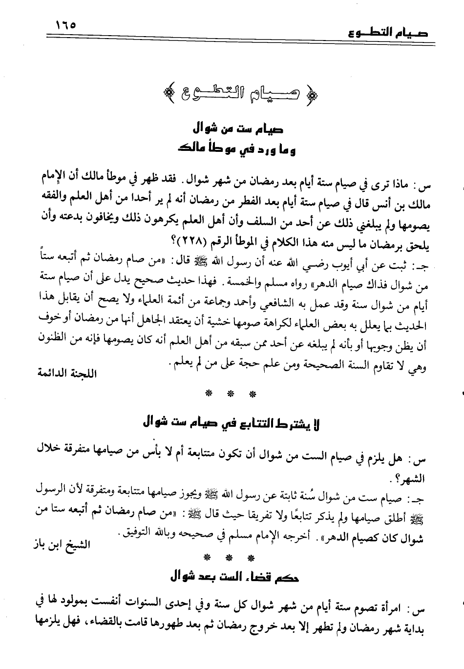 س ماذا ترى في صيام ستة أيام بعد رمضان من شهر شوال. فقد ظهر في موطأ مالك أن الإمام مالك بن أنس قال في صيام ستة أيام بعد الفطر من رمضان أنه لم ير أحدا من أهل العلم والفقه يصومها ولم يبلغني ذلك عن أحد من السلف وأن أهل العلم يكرهون ذلك ويخافون بدعته وأن يلحق برمضان ما ليس منه هذا الكلام في الموطأ الرقم (228) ؟