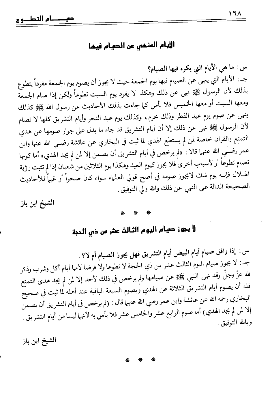 ج الأيام التي ينهى عن الصيام فيها يوم الجمعة حيث لا يجوز أن يصوم يوم الجمعة مفرداً يتطوع بذلك لأن الرسول صلى الله علي وسلم نهى عن ذلك وهكذا لا يفرد يوم السبت تطوعاً ولكن إذا صام الجمعة ومعها السبت أو معها الخميس فلا بأس كما جاءت بذلك الأحاديث عن رسول الله صلى الله عليه وسلم كذلك ينهى عن صوم يوم عيد الفطر وذلك محرم، وكذلك يوم عيد النحر وأيام التشريق كلها لا تصام لأن الرسول صلى الله عليه وسلم نهى عن ذلك إلا أن أيام التشريق قد جاء ما يدل على جواز صومها عن هدي التمتع والقران خاصة لم يستطع الهدي لما ثبت في البخاري عن عائشة رضي الله عنها وابن عمر رضي الله عنهما قالا ((لم يرخص في أيام التشريق أن يصمن إلا لمن لم يجد الهدي)) أما كونها تصام تطوعاً أو لأسباب أخرى فلا يجوز كيوم العيد وهكذا يوم الثلاثين من شعبان إذا لم تثبت رؤية الهلال فإنه يوم شك لا يجوز صومه في أصح قولي العلماء سواء كان صحواً أو غيماً للأحاديث الصحيحة الدالة على النهي عن ذلك والله ولي التوفيق.