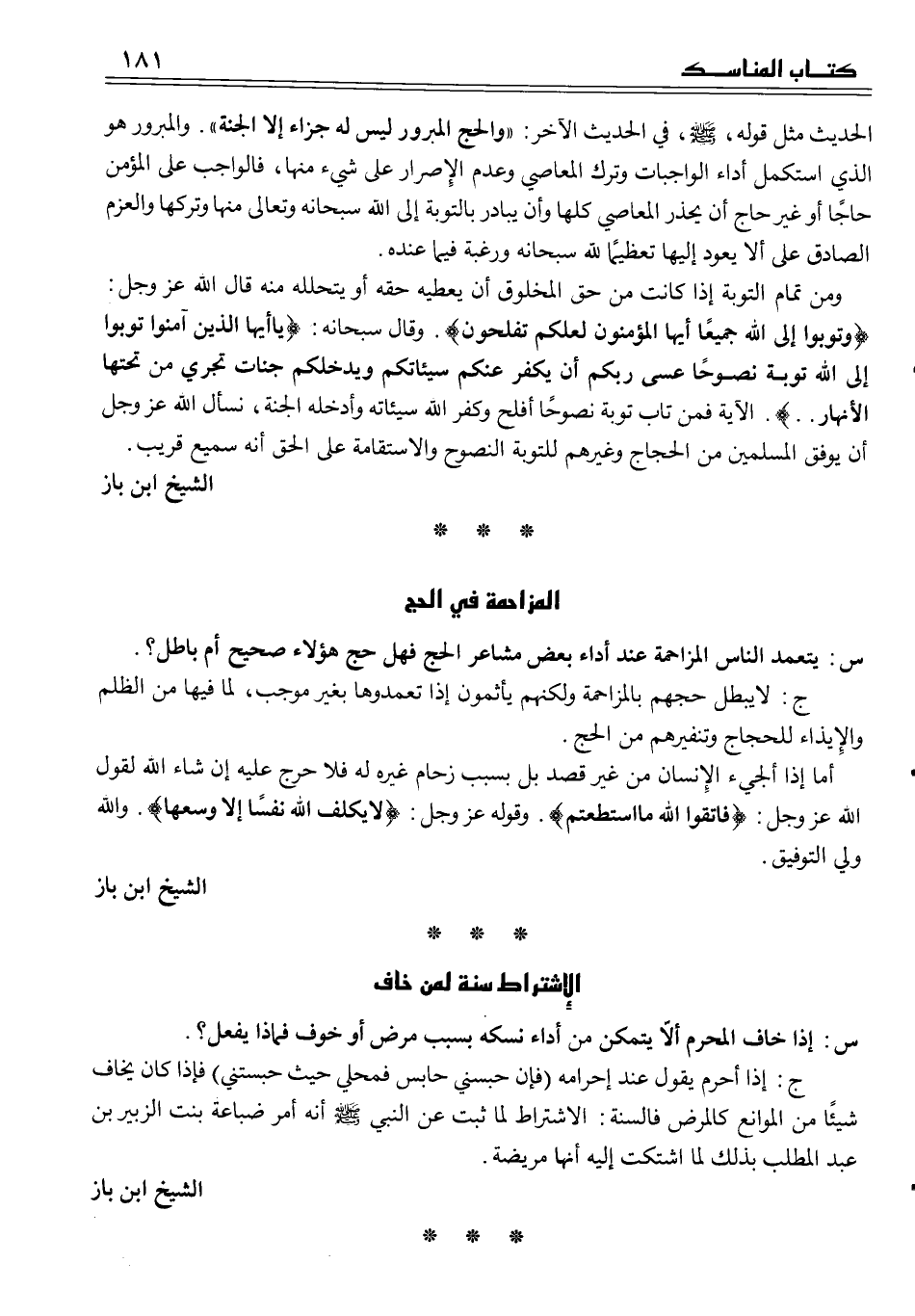 ومن تمام التوبة إذا كانت من حق المخلوق أن يعطيه حقه أن يتحلله منه قال الله عز وجل (وتوبوا إلى الله جميعاً أيها المؤمنون لعلكم تفلحون) . وقال سبحانه (يا أيها الذين آمنوا توبوا إلى الله توبة نصوحاً عسى ربكم أن يكفر عنكم سيئاتكم ويدخلكم جنات تجري من تحتها الأنهار..) . الآية فمن تاب توبة نصوحاً أفلح وكفر الله سيئاته وأدخله الجنة، نسأل الله عز وجل أن يوفق المسلمين من الحجاج وغيرهم للتوبة النصوح والاستقامة على الحق أنه سميع قريب