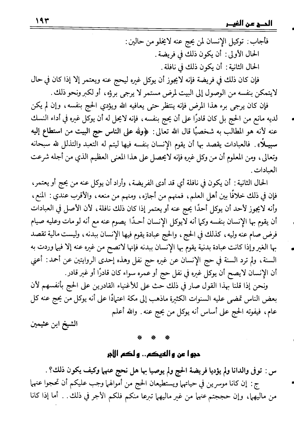 احال الثانية أن يكون في نافلة أي قد أدى الفريضة، وأراد أن يوكل عنه من يحج أو يعتمر، فإن في ذلك خلافاً بين أهل العلم، فمنهم من أجازه، ومنهم من منعه، والأقرب عندي المنع، وأنه لا يجوز لأحد أن يوكل أحداً يحج عنه أو يعتمر إذا كان ذلك نافلة، لأن الأصل في العبادات أن يقوم بها الإنسان بنفسه وكما أنه لا يوكل الإنسان أحداً يصوم عنه مع أنه لو مات وعليه صيام فرض صام عنه وليه، كذلك في الحج، والحج عبادة يقوم فيها الإنسان ببدنه، وليست مالية تقصد بها الغير وإذا كانت عبادة بدنية يقوم بها الإنسان ببدنه فإنها لا تصح من غيره عنه إلا فيما وردت به السنة، ولم ترد السنة في حج الإنسان عن غيره حج نفل وهذه إحدى الروايتين عن أحمد أعني أن الإنسان لا يصح أن يوكل غيره في نفل حج أو عمره سواء كان قادراً أو غير قادر. ونحن إذا قلنا بهذا القول صار في ذلك حيث على للأغنياء القادرين على الحد بأنفسهم لأن بعض الناس تمضي عليه السنوات الكثيرة ما ذهب إلى مكة اعتماداً على أنه يوكل من يحج عنه كل عام، فيفوته الحج على أساس أنه يوكل من يحج عنه. والله أعلم