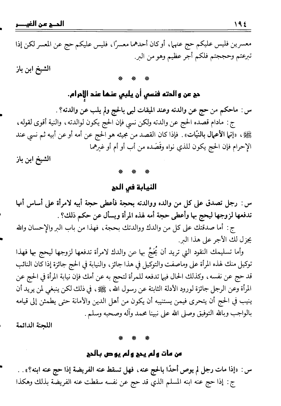 وأما تسليمك النقود التي تريد أن يُحَجَّ بها عن والدك لامرأة تدفعها لزوجها ليحج بها فهذا توكيل منك لهذه المرأة على وما صفت والتوكيل في هذا جائز والنيابة في الحج جائزة إذا كان النائب قد حج عن نفسه، وكذلك الحال فيما تدفعه للمرأة لتحج به عن أمك فإن نيابة المرأة في الحج عن المرأة وعن الرحل جائزة لورود الأدلة الثابتة عن رسول الله، صلى الله عليه وسلم، في ذلك لكن ينبغي لمن يريد أن ينيب في الحج أن يتحرى فيمن يستنيبه أن يكون من أهل الدين والأمانة حتى يطمئن إلى قيامه بالواجب وبالله التوفيق وصلى الله على نبينا محمد وآله وصحبه وسلم.