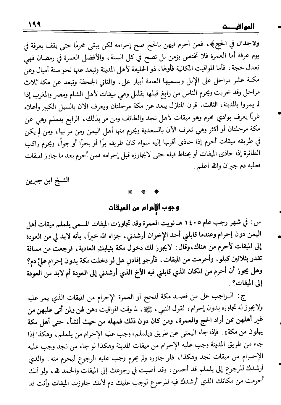 ولا جدال في الحج) ، فمن أحرم فيهن بالحج صح إحرامه لكن يبقى محرماً حتى يقف بعرفة في يوم عرفة أما العمرة فلا تختص بزمن بل تصح في كل السنة، والأفضل العمرة في رمضان فهي تعدل حجة، فأما المواقيت المكانية فأولها، ذو الحليفة لأهل المدينة وتبعد عنها نحو ستة أميال وعن مكة عشر مراحل على الإبل وسميها العامة أبيار علي، والثاني الجحفة وتبعد عن مكة ثلاث مراحل وقد خربت ويحرم الناس من رابغ قبلها بقليل وهي ميقات لأهل الشام ومصر والمغرب إذا لم يمروا بالمدينة، الثالث، قرن المنازل يبعد عن مكة مرحلتان ويعرف الآن بالسيل الكبير وأعلاه غرباً يعرف بوادي محرم وهو ميقات لأهل نجد والطائف ومن مر بذلك، والرابع يلملم وهي عن مكة مرحلتان أو أكثر وهي تعرف الآن بالسعدية ويحرم منها أهل اليمن ومن مر بها، ومن لم يكن في طريقه ميقات أحرم إذا حاذى أقربها إليه سواء كان طريقه براً أو بحراً أو جواً، ويحرم راكب الطائرة إذا