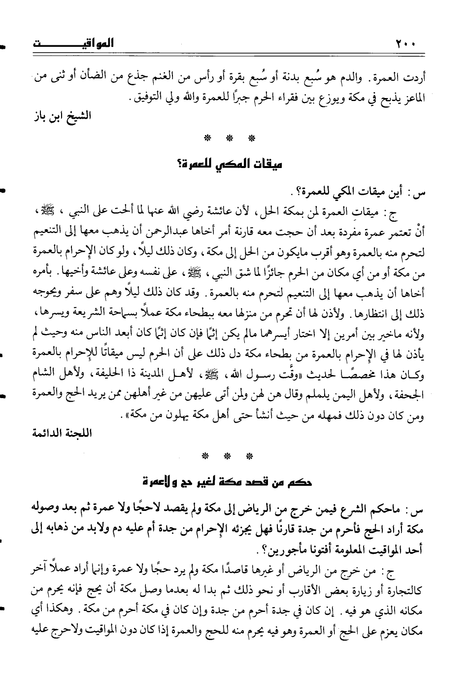 ج ميقات العمرة لمن بمكة الحل، لأن عائشة رضي الله عنها لما ألحت على النبي، صلى الله عليه وسلم، أن تعتمر عمرة مفردة بعد أن حجت معه قارنة أمر أخاها عبد الرحمن أن يذهب معها إلى التنعيم لتحرم منه بالعمرة وهو أقرب ما يكون من الحل إلى مكة، وكان ذلك ليلاً، ولو كان الإحرام بالعمرة من مكة أو من أي مكان من الحرم جائزاً لما شق النبي، صلى الله عليه وسلم، على نفسه وعلى عائشة وأخيها. بأمره أخاها أن يذهب معها إلى التنعيم لتحرم منه بالعمرة. وقد كان ذلك ليلاً وهم على سفر ويحوجه ذلك إلى انتظارها. ولأذن لها أن تحرم من منزلها معه ببطحاء مكة عملاً بسماحة الشريعة ويسرها، ولأنه ما خير بين أمرين إلا اختار أيسرهما ما لم يكن إثماً فإن كان إثماً أبعد الناس منه وحيث لم يأذن لها في الإحرام بالعمرة من بطحاة مكة دل ذلك على أن الحرم ليس ميقاتاً للإحرام بالعمرة وكان هذا مخصصاً لحديث ((وقت رسول الله، صلى الله عليه وسلم، لأهل المدينة ذا الحليفة، ولأهل الشام الجحفة، ولأهل اليمن يلملم وقال هن لهن ولمن أتى عليهن من غير أهلهن ممن يريد الحج والعمرة ومن كان دون ذلك فمهله من حيث أنشأ حتى أهل مكة يهلون من مكة)) .
