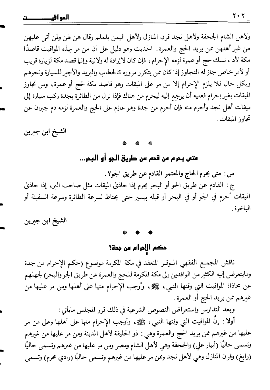 ناقش المجمع الفقهي الوقر المنعقد في مكة المكرمة موضوع (حكم الإحرام من جدة وما يتعرض إليه الكثير من الوافدين إلى مكة المكرمة للحج والعمرة عن طريق الجو والبحر) لجهلهم عن محاذاة المواقيت التي وقتها النبي، صلى الله عليه وسلم، وأوجب الإحرام منها على أهلها ومن مر عليها من غيرهم ممن يريد الحج والعمرة.