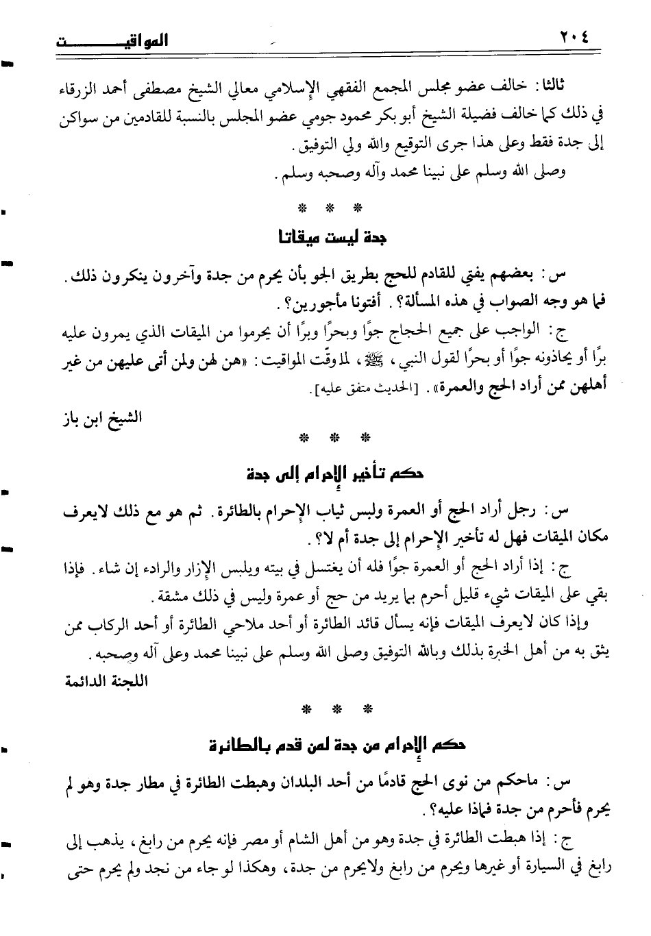ثالثاً خالف عضو مجلس المجمع الفقهي الإسلام معالي الشيخ مصطفى أحمد الزرقاء في ذلك كما خالف فضيلة الشيخ أبو بكر محمود جومي عضو المجلس بالنسبة للقادمين من سواكن إلى جدة فقط وعلى هذا جرى التوقيع والله ولي التوفيق.