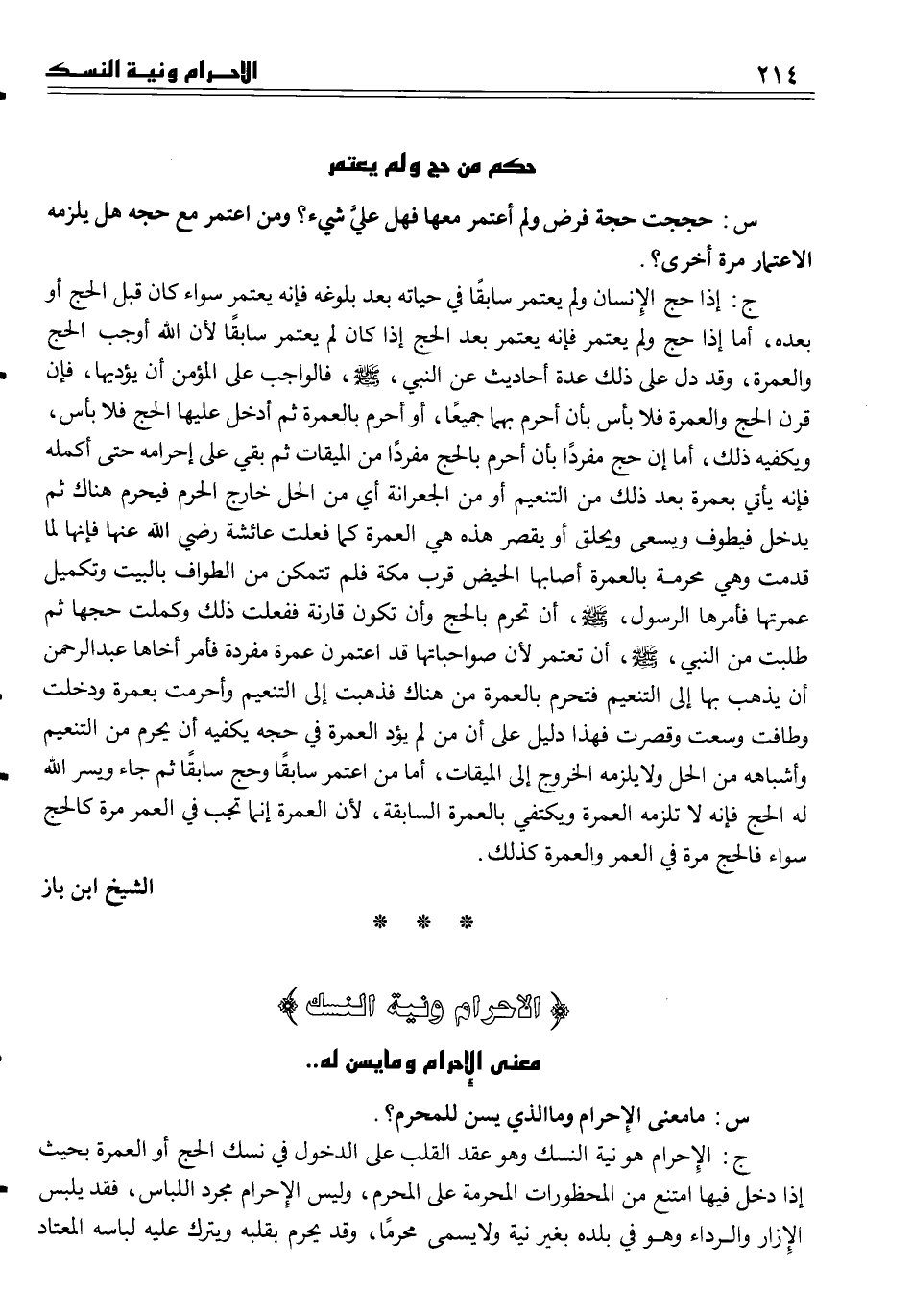 ج إذا حج الإنسان ولم يعتمر سابقاً في حياته بعد بلوغه فأنه يعتمر سواء كان قبل الحج أو بعده، أما إذا حج ولم يعتمر فإنه يعتمر بعد الحج إذا كان لم يعتمر سابقاً لأن الله أوجب الحج والعمرة، وقد دل على ذلك عدة أحاديث عن النبي، صلى الله عليه وسلم فالواجب على المؤمن أن يؤديها، فإن قرن الحج والعمرة فلا بأس بأن أحرم بهما جميعاً، أو أحرم بالعمرة ثم أدخل عليها الحج فلا بأس، ويكفيه ذلك، أما إن حج مفرداً بأن أحرم بالحج مفرداً من الميقات ثم بقي على إحرامه حتى أكمله فإنه يأتي بعمرة بعد ذلك من التنعيم أو من الجعرانة أي من الحل خارج الحرم فيحرم هناك ثم يدخل فيطوف ويسعى ويحلق أو يقصر هذه هي العمرة كما فعلت عائشة رضي الله عنها فإنها لما قدمت وهي محرمة بالعمرة أصابها الحيض قرب مكة فلم تتمكن من الطواف بالبيت وتكميل عمرتها فأمرها الرسول، صلى الله عليه وسلم، أن تحرم بالحج وأن تكون قارنة ففعلت ذلك وكملت حجها ثم طلبت من النبي، صلى الله عليه وسلم، أن تعتمر لأن صواحباتها قد اعتمرن عمرة مفردة فأمر أخاها عبد الرحمن أن يذهب بها إلى التنعيم فتحرم بالعمرة من هناك فذهبت إلى التنعيم وأحرمت بعمرة ودخلت وطافت وسعت وقصرت فهذا دليل على أن من لم يؤد العمرة في حجه يكفيه أن يحرم من التنعيم وأشباهه من الحل ولا يلزمه الخروج إلى الميقات، أما من اعتمر سابقاً وحج سابقاً ثم جاء ويسر الله له الحج فإنه لا تلزمه العمرة ويكتفي بالعمرة السابقة، لأن العمرة إنما تجب في العمرة مرة كالحج سواء فالحج مرة في العمر والعمرة كذلك.