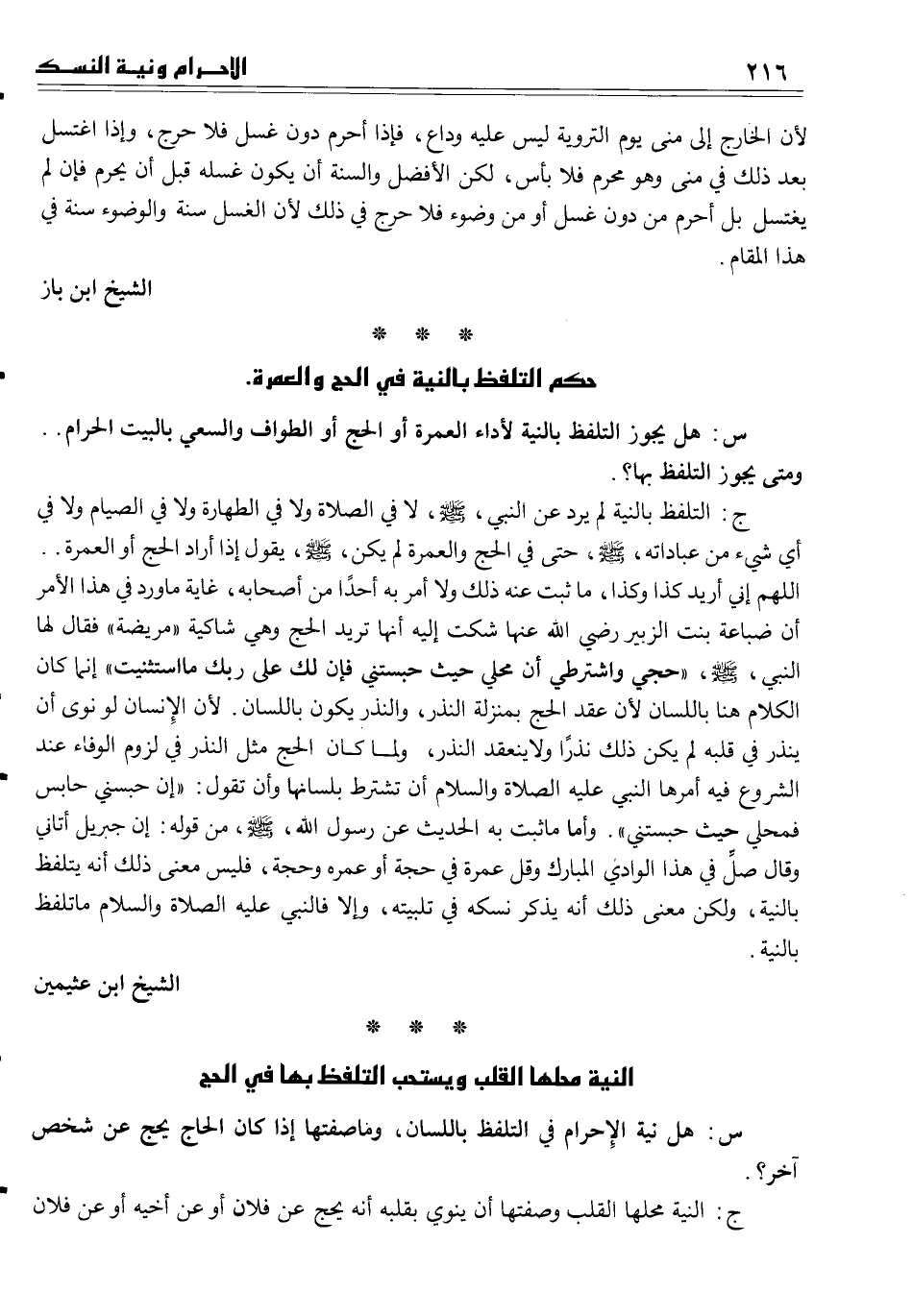 اللهم إني أريد كذا وكذا، ما ثبت عنه ذلك ولا أمر به أحداً من أصحابه، غاية ما ورد في هذا الأمر أن ضباعة بنت الزبير رضي الله عنها شكت إليه أنها تريد الحج وهي شاكية ((مريضة)) فقال لها النبي، صلى الله عليه وسلم، ((حجي واشترطي أن محلي حيث حبستني فإن لك على ربك ما استثنيت)) إنما كان الكلام هنا باللسان لأن عقد الحج بمنزلة النذر، والنذر يكون باللسان. لأن الإنسان لو نوى أن ينذر في قلبه لم يكن ذلك نذراً ولا تنعقد النذر، ولما كان الحج مثل النذر في لزوم الوفاء عند الشروع فيه أمرها النبي عليه الصلاة والسلام أن تشترط بلسانها وأن تقول ((إن حبسني حابس فمحلي حيث حبستني)) . وأما ما ثبت به الحديث عن رسول الله، صلى الله عليه وسلم، من قوله إن جبريل أتاني وقال صلَّ في هذا الوادي المبارك وقل عمرة في حجة أو عمرة وحجة، فليس معنى ذلك أنه يتلفظ بالنية، ولكن معنى ذلك أنه يذكر نسكه في تلبيته، وإلا فالنبي، عليه الصلاة والسلام ما تلفظ بالنية.