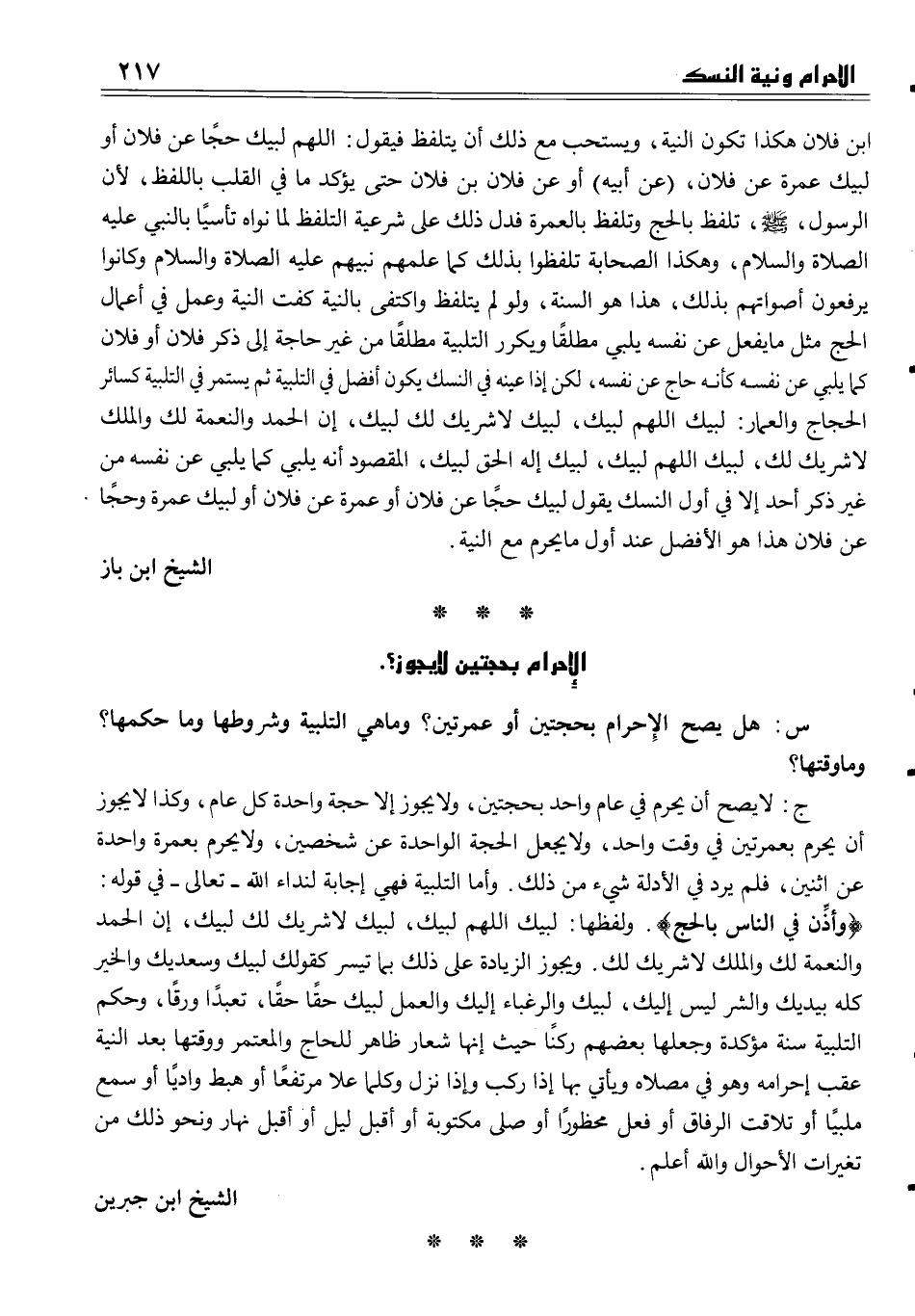 ابن فلان هكذا تكون النية، ويستحب مع ذلك أن يتلفظ فيقول اللهم لبيك حجاً عن فلان أو لبيك عمرة عن فلان، (عن أبيه) أو عن فلان بن فلان حتى يؤكد ما في القلب باللفظ، لأن الرسول، صلى الله عليه وسلم، تلفظ بالحج وتلفظ بالعمرة فدل ذلك على شرعية التلفظ لما نواه تأسياً بالنبي عليه الصلاة والسلام، وهكذا الصحابة تلفظوا بذلك كما علمهم نبيهم عليه الصلاة والسلام وكانوا يرفعون أصواتهم بذلك، هذا هو السنة، ولو لم يتلفظ واكتفى بالنية كفت النية وعمل في أعمال الحج مثل ما يفعل عن نفسه يلبي مطلقاً ويكرر التلبية مطلقاً من غير حاجة إلى ذكر فلان أو فلان كما يلبي عن نفسه كأنه حاج عن نفسه، لكن إذا عينه في النسك يكون أفضل في التلبية ثم يستمر في التلبية كسائر الحجاج والعمار لبيك اللهم لبيك، لبيك لا شريك لك لبيك، إن الحمد والنعمة لك والملك لا شريك لك، لبيك اللهم لبيك، لبيك إله الحق لبيك، المقصود أنه يلبي كما يلبي عن نفسه من غير ذكر أحد إلا في أول النسك يقول لبيك حجاً عن فلان أو عمرة عن فلان أو لبيك عمرة وحجاً عن فلان هذا هو الأفضل عند أول ما يحرم مع النية.