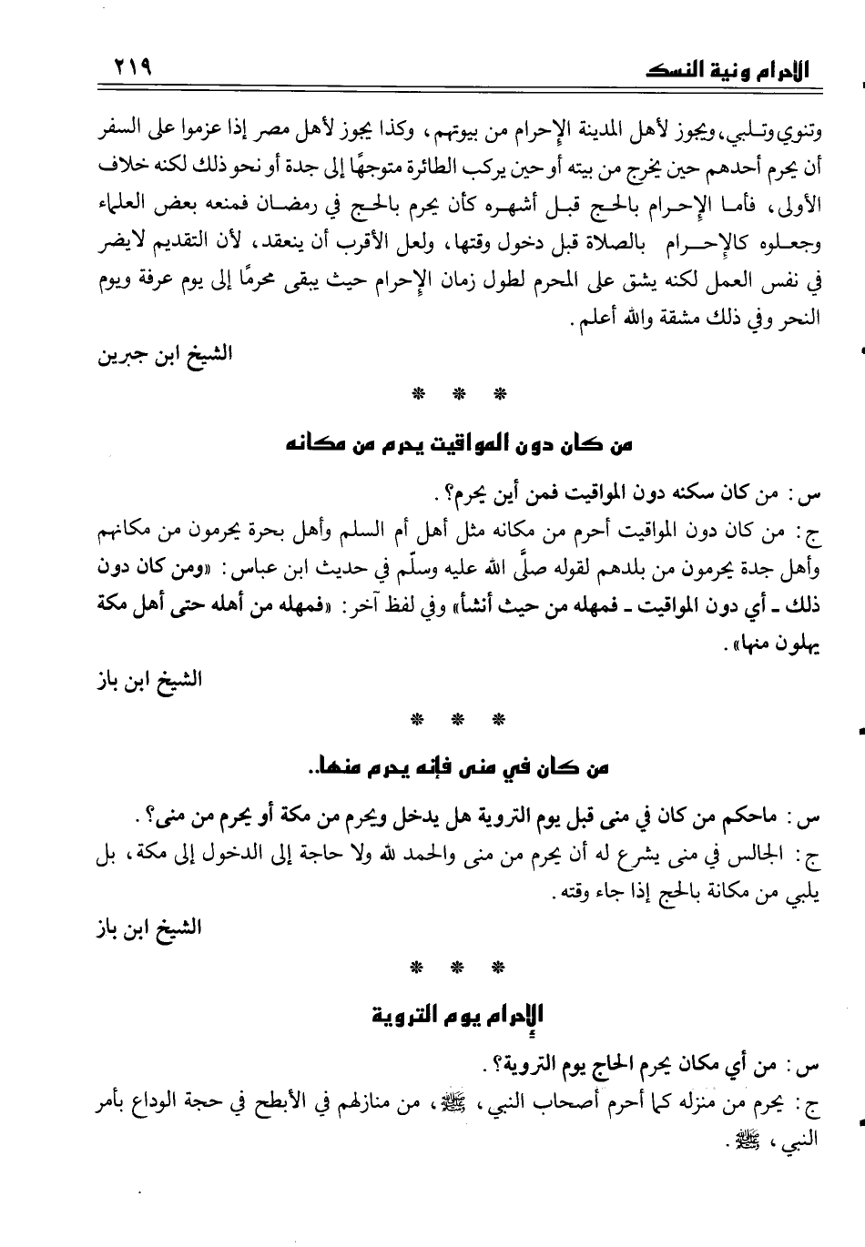 وتنوي وتلبي، ويجوز لأهل المدينة الإحرام من بيوتهم، وكذا يجوز لأهل مصر إذا عزموا على السفر أن يحرم أحدهم حين يخرج من بيته أو حين يركب الطائرة متوجهاً إلى جدة أو نحو ذلك لكنه خلاف الأولى، فأما الإحرام بالحج قبل أشهره كأن يحرم بالحج في رمضان فمنعه بعض العلماء وجعلوه كالإحرام بالصلاة قبل دخول وقتها، ولعل الأقرب أن ينعقد، لأن التقديم لا يضر في نفس العمل لكنه يشق على المحرم لطول زمان الإحرام حيث يبقى محرماً إلى يوم عرفة ويوم النحر وفي ذلك مشقة والله أعلم.