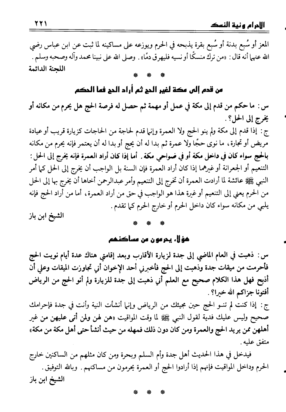 ج إذا قدم إلى مكة ولم ينو الحج ولا العمرة وإنما قدم لحاجة من الحاجات كزيارة قريب أو عيادة مريض أو تجارة، ما نوى حجاً ولا عمرة ثم بدا له أن يحج أو بدا له أن يعتمر فإنه يحرم من مكانه بالحج سواء كان في داخل مكة أو في ضواحي مكة. أما إذا كان أراد العمرة فإنه يخرج إلى الحل التنعيم أو الجعرانة أو غيرهما إذا كان أراد العمرة فإن السنة بل الواجب أن يخرج إلى الحل كما أمر النبي صلى الله عليه وسلم عائشة لما أرادت العمرة أن تخرج إلى التنعيم وأمر عبد الرحمن أخاها أن يخرج بها إلى الحل من الحرم يعني إلى التنعيم أو غيرة هذا هو الواجب في حق من أراد العمرة، أما من أراد الحج فإنه يلبي من مكانه سواء كان داخل الحرم أو خارج الحرم كما تقدم.