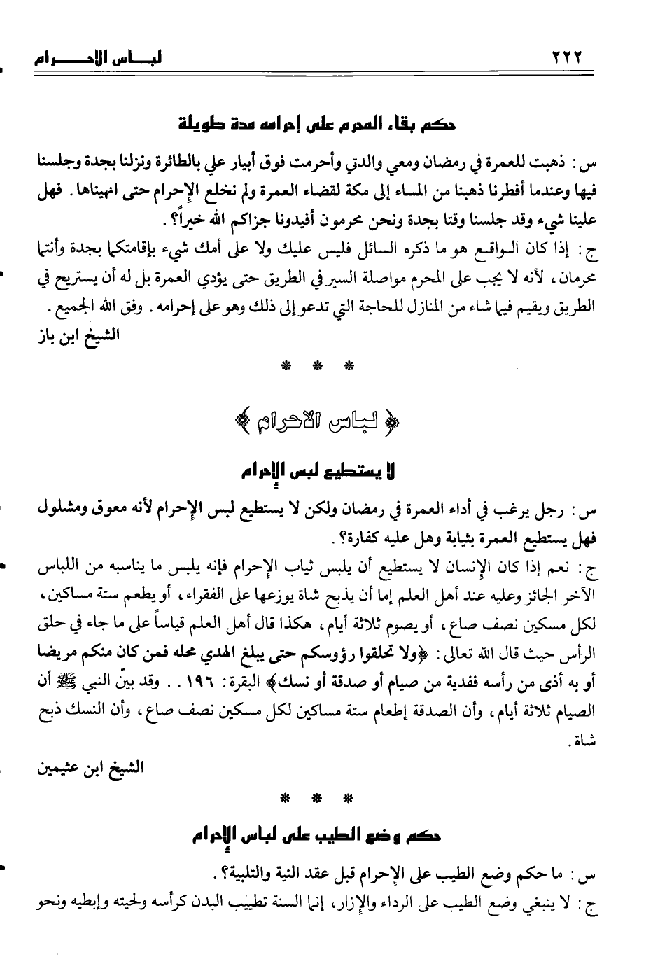 ج نعم إذا كان الإنسان لا يستطيع أن يلبس ثياب الإحرام فإنه يلبس ما يناسبه من اللباس الآخر الجائز وعليه عند أهل العلم إما أن يذبح شاة يوزعها على الفقراء، أو يطعم ستة مساكين، لكل مسكين نصف صاع، أو يصوم ثلاثة أيام، هكذا قال أهل العلم قياساً على ما جاء في حلق الرأس حيث قال الله تعالى (ولا تحلقوا رؤوسكم حتى يبلغ الهدي محله فمن كان منكم مريضا أو به أذى من رأسه ففدية من صيام أو صدقة أو نسك) البقرة 196. . وقد بينّ النبي صلى الله عليه وسلم أن الصيام ثلاثة أيام، وأن الصدقة إطعام ستة مساكين لكل مسكين نصف صاع، وأن النسك ذبح شاة.