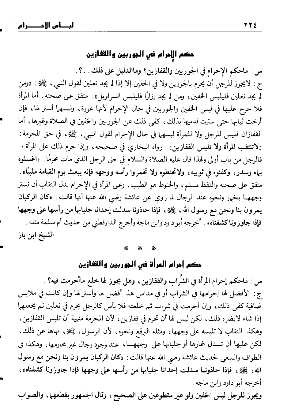 ج لا يجوز للرجل أن يحرم بالجورين ولا في الخفين إلا إذا لم يجد نعلين لقول النبي، صلى الله عليه وسلم ((ومن لم يجد نعلين فليلبس الخفين، ومن لم يجد إزاراً فليلبس السروايل)) . متفق على صحته. أما المرأة فلا حرج عليها في لبس الخفين والجوربين في حال الإحرام لأنها عورة، ولبسهما أستر لها، فإن أرخت ثيابها حتى سترت قدميها بذلك، كفى ذلك عن الجوربين والخفين في الصلاة وغيرها، أما القفازان فليس للرجل ولا للمرأة لبسهما في حال الإحرام لقول النبي، صلى الله عليه وسلم، في حق المحرمة ((لا تنتقب المرأة ولا تلبس القفازين)) . رواه البخاري في صحيحه، وإذا حرم ذلك على المرأة، فالرجل من باب أولى ولهذا قال عليه الصلاة والسلام في حق الرجل الذي مات محرماً ((اغسلوه بماء وسدر، وكفنوه في ثوبيه، ولا تحنطوه ولا تخمروا رأسه ووجهه فإنه يبعث يوم القيامة ملبياً)) .