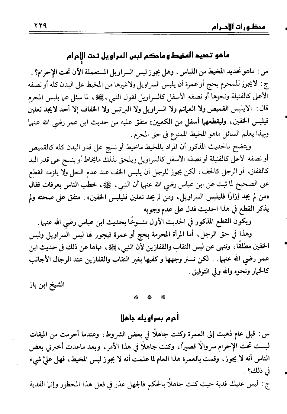 وهذا في حق الرجل، أما المرأة المحرمة بحج أو عمرة فيجوز لها لبس السراويل ولبس الخفين مطلقاً، وتنهى عن لبس النقاب والقفازين لأن النبي، صلى الله عليه وسلم نهاها، عن ذلك في الحديث ابن عمر رضي الله عنهما. . لكن تستر وجهها وكفيها بغير النقاب والقفازين عند الرجل الأجانب كالخمار ونحوه والله ولي التوفيق.