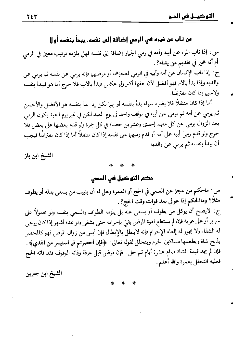 ج إذا ناب الإنسان عن أمه وأبيه في الرمي لعجزهما أو مرضهما فإنه يرمي عن نفسه ثم يرمي عن والديه وإذا بدأ بالأم فهو أفضل لأن حقها أكبر ولو عكس فبدأ بالأب فلا حرج أما هو فيبدأ بنفسه ولا سيما إذا كان مفترضاً.