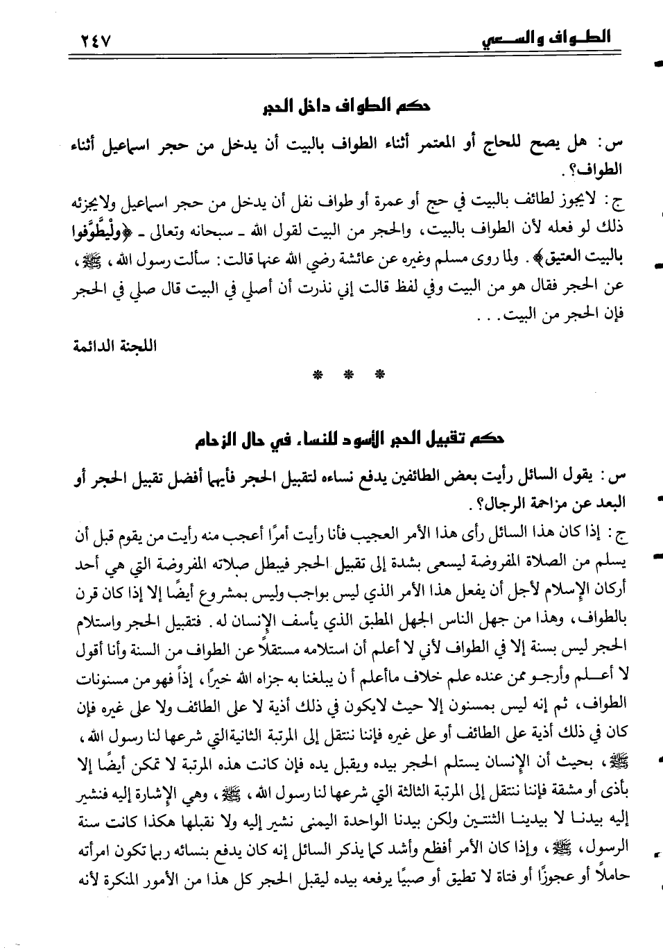 ج إذا كان هذا السائل رأى هذا الأمر العجيب فأنا رأيت أمراً أعجب منه رأيت من يقول قبل أن يسلم من الصلاة المفروضة ليسعى بشدة إلى تقبيل الحجر فيبطل صلاته المفروضة التي هي أحد أركان الإسلام لأجل أن يفعل هذا الأمر الذي ليس بواجب وليس بمشروع أيضاً إلا إذا كان قرن بالطواف، وهذا من جهل الناس الجهل المطبق الذي يأسف الإنسان له فتقبيل الحجر واستلام الحجر ليس بسنة إلا في الطواف لأني لا أعلم أن استلامه مستقلاً عن الطواف من السنة وأنا أقول لا أعلم وأرجوا ممن عنده علم خلاف ما أعلم أن يبلغنا به جزاه الله خيراً، إذاً فهو من مسنونات الطواف، ثم إنه ليس بمسنون إلا حيث لا يكون في ذلك أذية لا على الطائف ولا على غيره فإن كان في ذلك أذية على الطائف أو على غيره فإننا ننتقل إلى المرتبة الثانية التي شرعها لنا رسول الله، صلى الله عليه وسلم، بحيث أن الإنسان يستلم الحجر بيده ويقبل يده فإن كانت هذه المرتبة لا تمكن أيضاً إلا بأذى أو مشقة فإننا ننتقل إلى المرتبة الثالثة التي شرعها لنا رسول الله، صلى الله عليه وسلم، وهي الإشارة إليه فنشير إليه بيدنا لا بيدينا الثنتين ولكن بيدنا الواحدة اليمنى نشير إليه ولا نقبلها هكذا كانت سنة الرسول، صلى الله عليه وسلم، وإذا كان الأمر أفظع وأشد كما يذكر السائل إنه كان يدفع بنسائه ربما تكون امرأته حاملاً أو عجوزاً أو فتاة لا تطيق أو صبياً يرفعه بيده ليقبل الحجر كل هذا من الأمور المنكرة لأنه