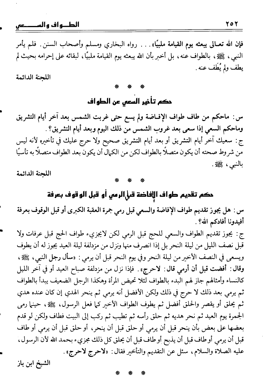 ج يجوز تقديم الطواف والسعي للحج قبل الرمي لكن لا يجزيء طواف الحج قبل عرفات ولا قبل نصف الليل من ليلة النحر بل إذا انصرف منها ونزل من مزدلفة ليلة العيد يجوز له أن يطوف ويسعى في النصف الأخير من ليلة النحر وفي يوم النحر قبل أن يرمي ((سأل رجل النبي، صلى الله عليه وسلم، وقال أفضت قبل أرمي قال لا حرج)) . فإذا نزل من مزدلفة صباح العيد أو في آخر الليل كالنساء وأمثالهم جازلهم البدء بالطواف لئلا تحيض المرأة وهكذا الرجل الضعيف يبدأ بالطواف ثم يرمي بعد ذلك لا حرج في ذلك ولكن الأفضل أنه يرمي ثم ينحر الهدي إن كان عنده هدي ثم يحلق أو يقصر والحلق أفضل ثم يطوف الطواف الأخير كما فعل الرسول، صلى الله عليه وسلم، حينما رمى الجمرة يوم العيد ثم نحر هديه ثم حلق رأسه ثم تطيب ثم ركب إلى البيت فطاف ولكن لو قدم بعضها على بعض بأن ينحر قبل أن يرمي أو حلق قبل أن ينحر، أو حلق قبل أن يرمي أو طاف قبل أن يرمي أو طاف قبل أن يذبح أو طاف قبل أن يحلق كل ذلك مجزيء بحمد الله لأن الرسول، عليه الصلاة والسلام، سئل عن التقديم والتأخير فقال ((لا حرج لا حرج)) .