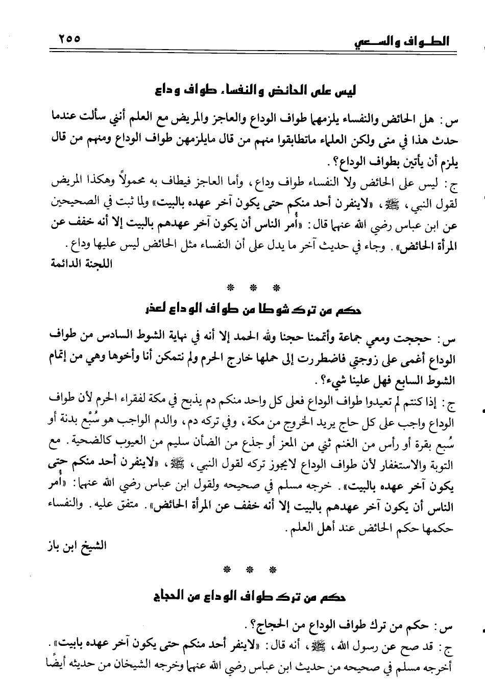 س هل الحائض والنفساء يلزمها طواف الوداع والعاجز والمريض مع العلم أنني سأل عندما حدث هذا في منى ولكن العلماء ما تطابقوا منهم من قال ما يلزمهن طواف الوداع ومنهم من قال يلزم أن يأتين بطواف الوداع؟.