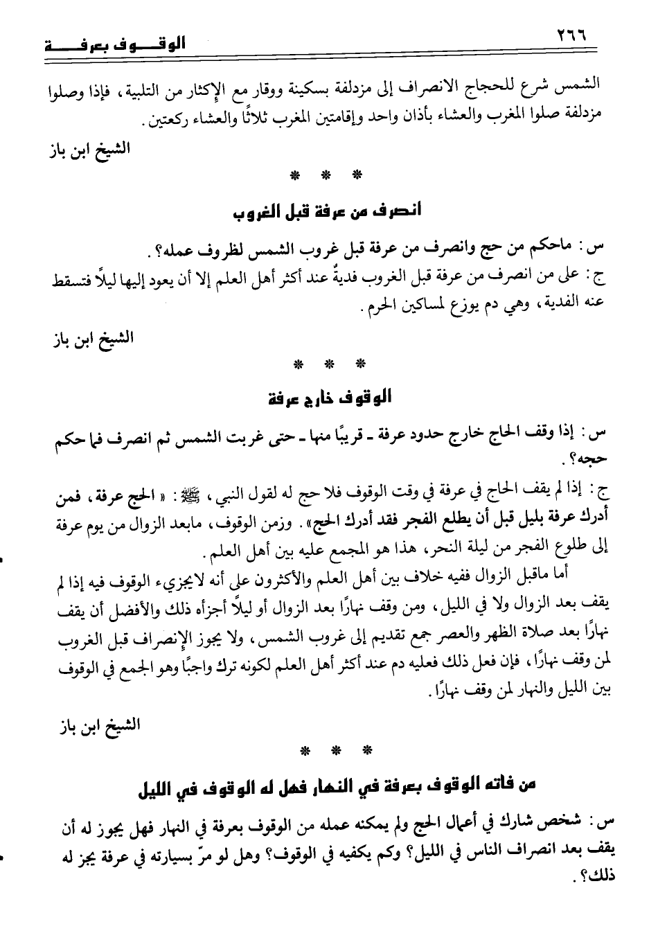 ج على من انصرف من عرفة قبل الغروب فديةٌ عند أكثر أهل العلم إلا أن يعود إليها ليلاً فتسقط عنه الفدية، وهي دم يوزع لمساكين الحرم.