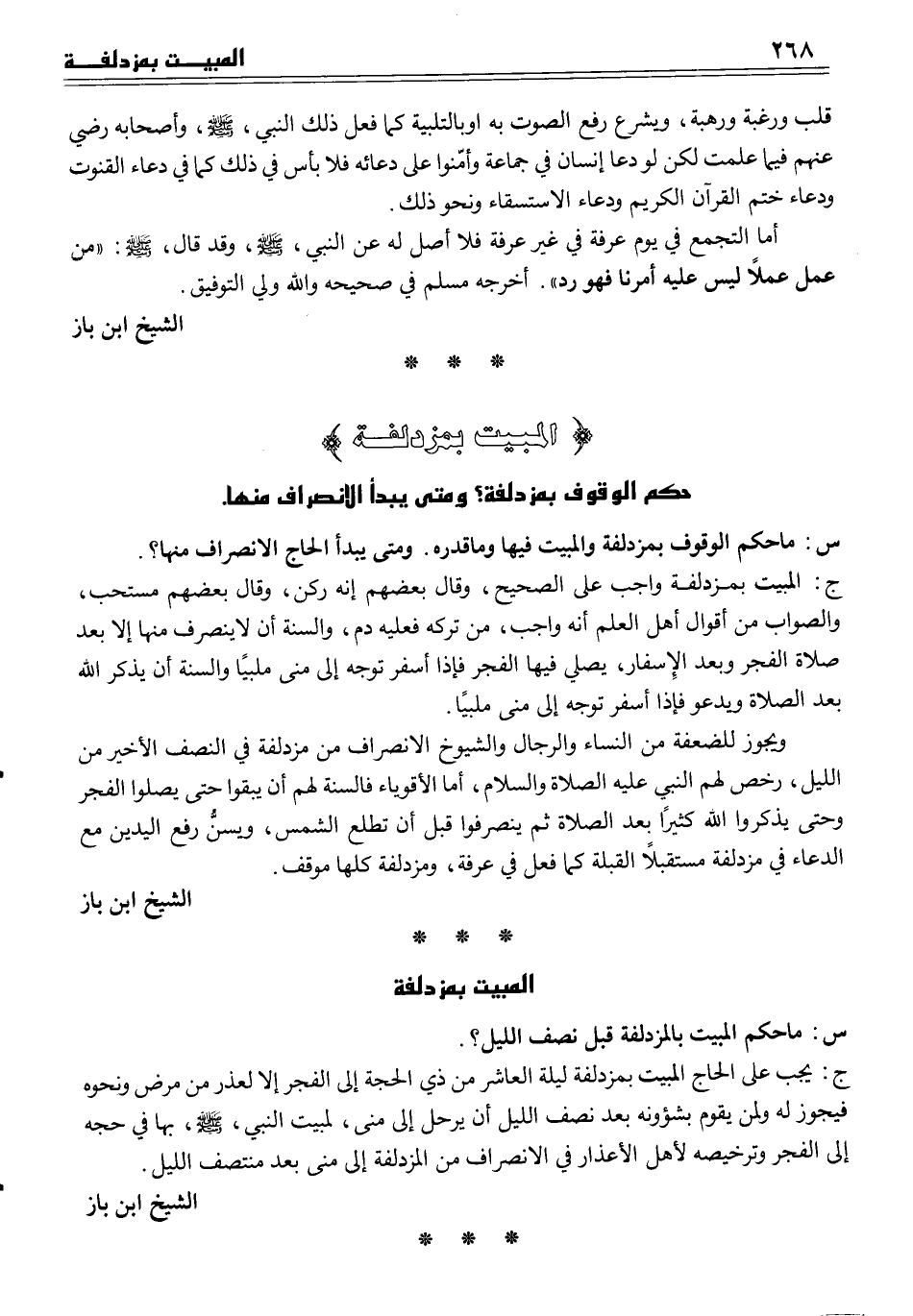 ويجوز للضعفة من النساء والرجل والشيوخ الانصراف من مزدلفة في النصف الأخير الليل، رخص لهم النبي عليه الصلاة والسلام، أما الأقوياء فالسنة لهم أن يبقوا حتى يصلوا الفجر وحتى يذكروا الله كثيراً بعد الصلاة ثم ينصرفوا قبل أن تطلع الشمس، ويسنُّ رفع اليدين مع الدعاء في مزدلفة مستقبلاً القبلة كما فعل في عرفة، ومزدلفة كلها موقف.