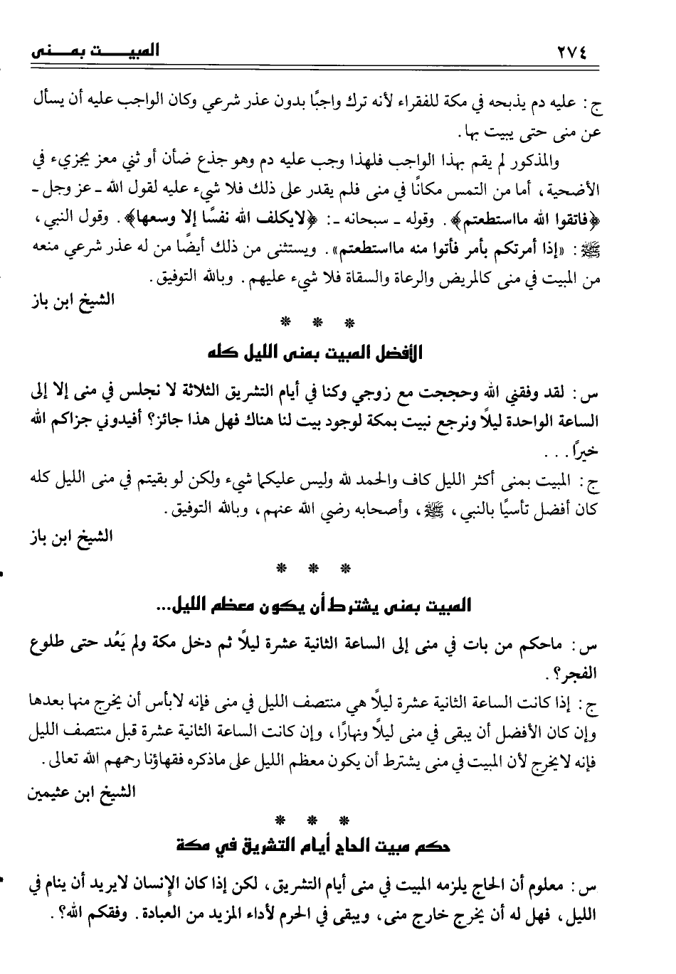 والمذكور لم يقم بهذا الواجب فلهذا وجب عليه دم وهو جذع ضأن أو ثني معز يجزيء في الأضحية، أما من التمس مكاناً في منى فلم يقدر على ذلك فلا شيء عليه لقول الله ـ عز وجل ــ (فاتقوا الله ما استطعتم) . وقوله ــ سبحانه ــ (لا يكلف الله نفساً إلا وسعها) . وقول النبي، صلى الله عليه وسلم ((إذا أمرتكم بأمر فأتوا منه ما استطعتم)) . ويستثنى من ذلك أيضاً من له عذر شرعي منعه من المبيت في منى كالمريض والرعاة والسقاة فلا شيء عليهم. وبالله التوفيق.