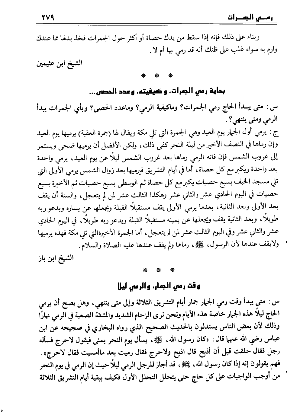 ج يرمي أول الجمار يوم العيد وهي الجمرة التي تلي مكة ويقال لها (جمرة العقبة) يرميها يوم العيد وإن رماها في النصف الأخير من ليلة النحر كفى ذلك، ولكن الأفضل أن يرميها ضحى ويستمر إلى غروب الشمس فإن فاته الرمي رماها بعد غروب الشمس ليلاً عن يوم العيد، يرمي واحدة بعد واحدة ويكبر مع كل حصاة، أما في أيام التشريق فيرميها بعد زوال الشمس يرمي الأولى التي تلي مسجد الخيف بسبع حصيات يكبر مع كل حصاة ثم الوسطي بسبع حصيات ثم الأخيرة بسبع حصيات في اليوم الحادي عشر والثاني عشر وهكذا الثالث عشر لمن لم يتعجل، والسنة أن يقف بعد الأولى وبعد الثاني، بعدما يرمي الأولى يقف مستقبلاً القبلة ويجعلها عن يساره ويدعو ربه طويلاً، وبعد الثانية يقف ويجعلها عن يمينه مستقبلاً القبلة ويدعو ربه طويلاً، في اليوم الحادي عشر والثاني عشر وفي اليوم الثالث عشر لمن لم يتعجل، أما الجمرة الأخيرة التي تلي مكة فهذه يرميها ولا يقف عندها لأن الرسول، صلى الله عليه وسلم، رماها ولم يقف عندها عليه الصلاة والسلام.