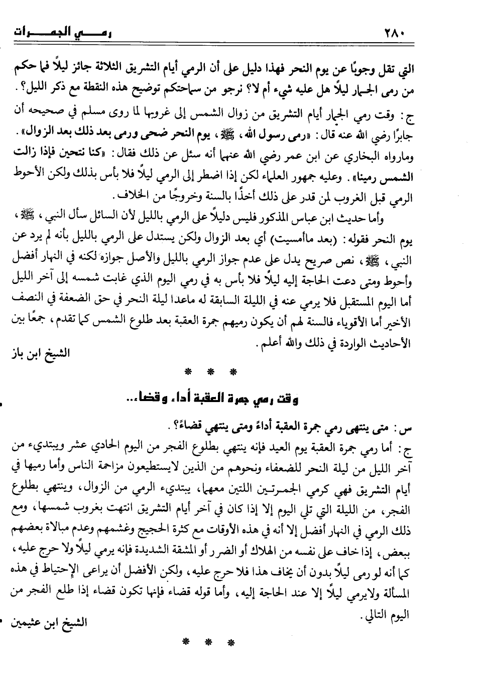وأما حديث ابن عباس المذكور فليس دليلاً على الرمي بالليل لأن السائل سأل النبي، صلى الله عليه وسلم، يوم النحر فقوله (بعد ما أمسيت) أي بعد الزوال ولكن يستدل على الرمي بالليل بأنه لم يرد عن النبي، صلى الله عليه وسلم، نص صريح يدل على عدم جواز الرمي بالليل والأصل جوازه لكنه في النهار أفضل وأحوط ومتى دعت الحاجة إليه ليلاً فلا بأس به في رمي اليوم الذي غابت شمسه إلى آخر الليل أما اليوم المستقبل فلا يرمي عنه في الليلة السابقة له ماعدا ليلة النحر في حق الضعفة في النصف الأخير أما الأقوياء فالسنة لهم أن يكون رميهم جمرة العقبة بعد طلوع الشمس كما تقدم، جمعاً بين الأحاديث الواردة في ذلك والله أعلم.