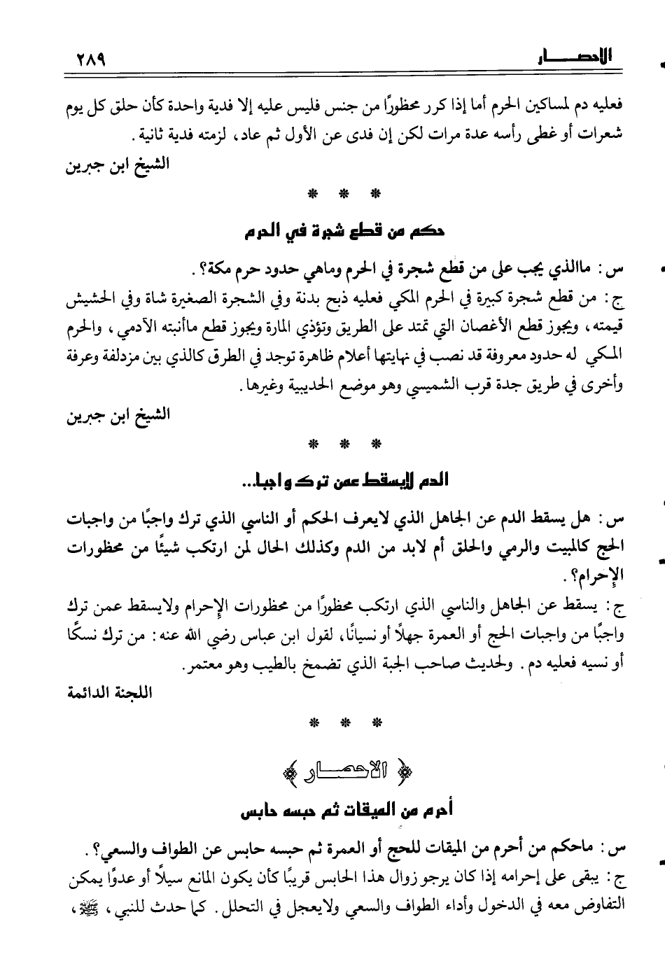 ج من قطع شجرة كبيرة في الحرم المكي فعليه دم بدنة وفي الشجرة الصغيرة شاة وفي الحشيش قيمته، ويجوز قطع الأغصان التي تمتد على الطريق وتؤذي المارة ويجوز قطع ما أنبته الآدمي، والحرم المكي له حدود معروفة قد نصب في نهايتها أعلام ظاهرة توجد في الطريق كالذي بين مزدلفة وعرفة وآخرى في طريق جدة قرب الشميسي وهو موضع الحديبية وغيرها.