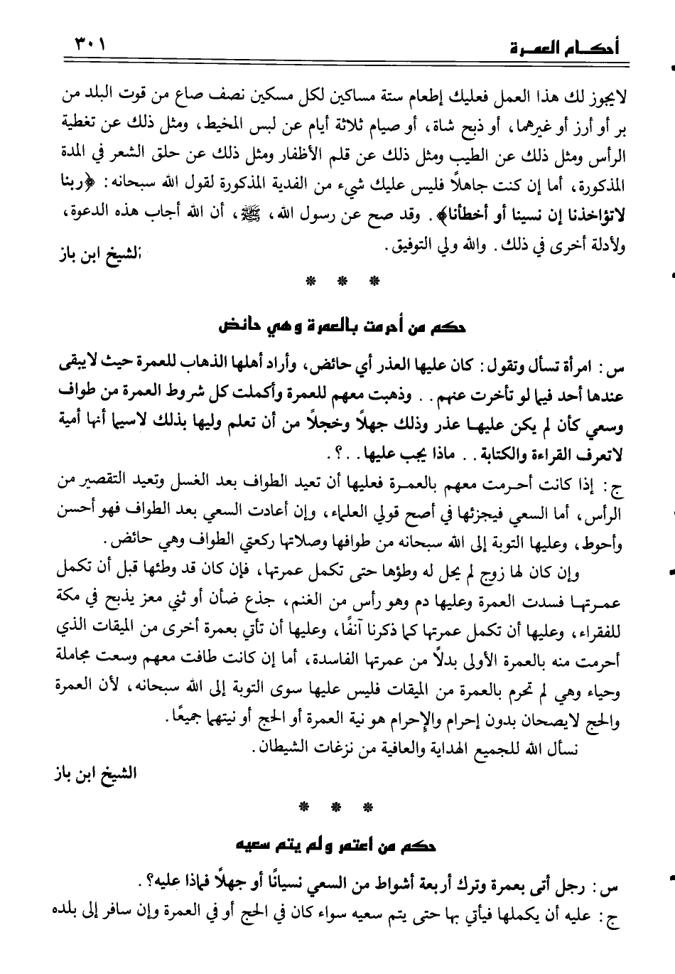 س امرأة تسأل وتقول كان عليها العذر أي حائض، وأراد أهلها الذهاب للعمرة حيث لا يبقى عندها أحد فيما لو تأخرت عنهم. . وذهبت معهم للعمرة وأكملت كل شروط العمرة من طواف وسعي كأن لم يكن عليها عذر وذلك جهلاً وخجلاً من أن تعلم وليها بذلك لاسيما أنها أمية لا تعرف القراءة والكتابة. . ماذا يجب عليها. .؟.