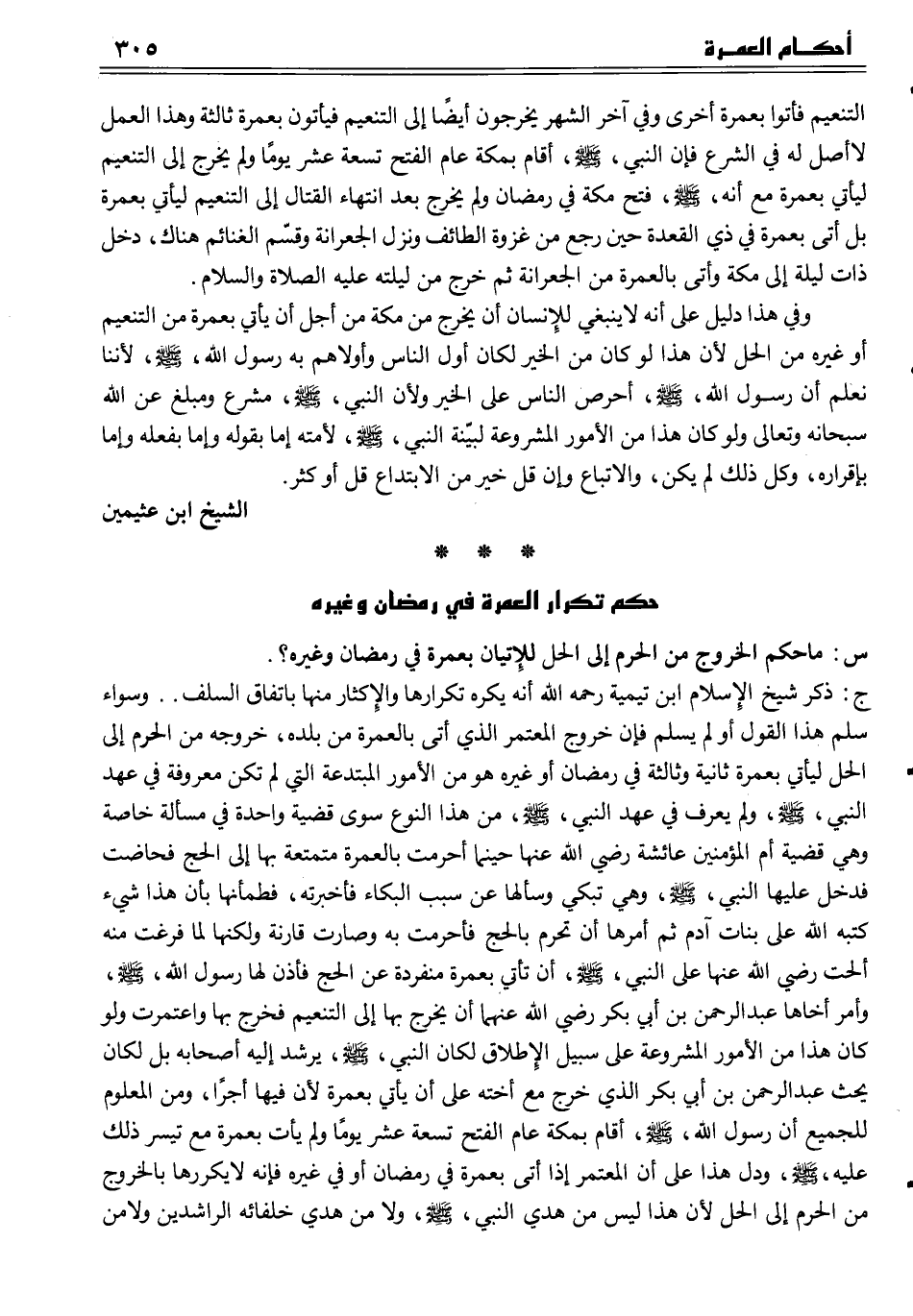 التنعيم فأتوا بعمرة أخرى وفي آخر الشهر يخرجون أيضاً إلى التنعيم فيأتون بعمرة ثالثة وهذا العمل لاأصل له في الشرع فإن النبي، صلى الله عليه وسلم، أقام بمكة عام الفتح تسعة عشر يوماً ولم يخرج إلى التنعيم ليأتي بعمرة مع أنه، صلى الله عليه وسلم، فتح مكة في رمضان ولم يخرج بعد انتهاء القتال إلى التنعيم ليأتي بعمرة بل أتى بعمرة في ذي القعدة حين رجع من غزوة الطائف ونزل الجعرانة وقسّم الغنائم هناك، دخل ذات ليلة إلى مكة وأتى بالعمرة من الجعرانة ثم خرج من ليلته عليه الصلاة والسلام.