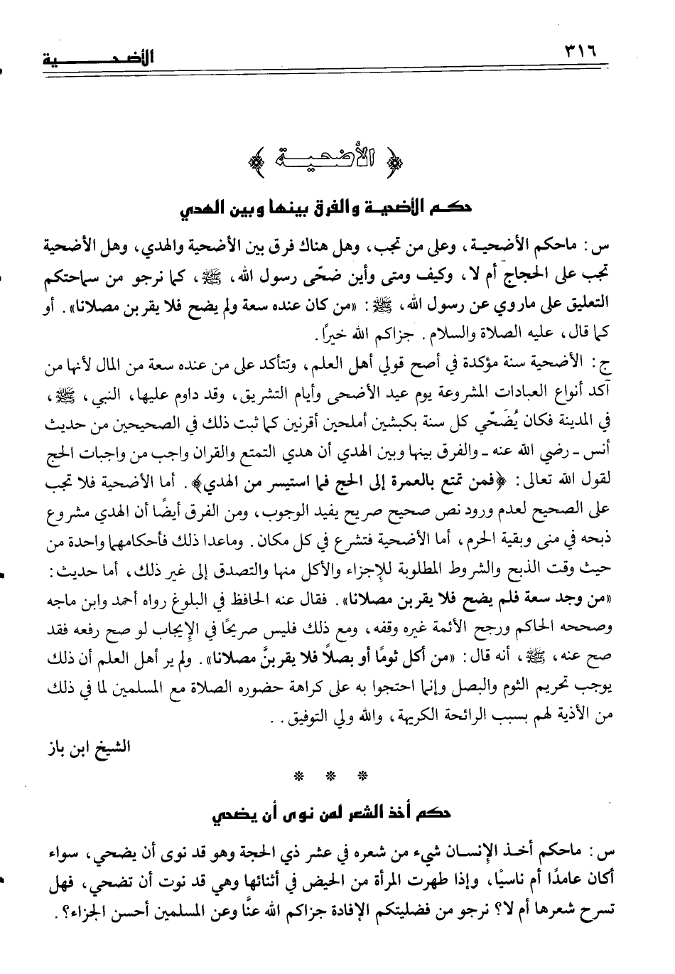 س ما حكم الأضحية، وعلى من تجب، وهل هناك فرق بين الأضحية والهدي، وهل الأضحية تجب على الحجاج أم لا، وكيف ومتى وأين ضحّى رسول الله، صلى الله عليه وسلم، كما نرجو من سماحتكم التعليق على ما روي عن رسول الله، صلى الله عليه وسلم ((من كان عنده سعة ولم يضح فلا يقربن مصلانا)) . أو كما قال، عليه والصلاة والسلام جزاكم الله خيراً.