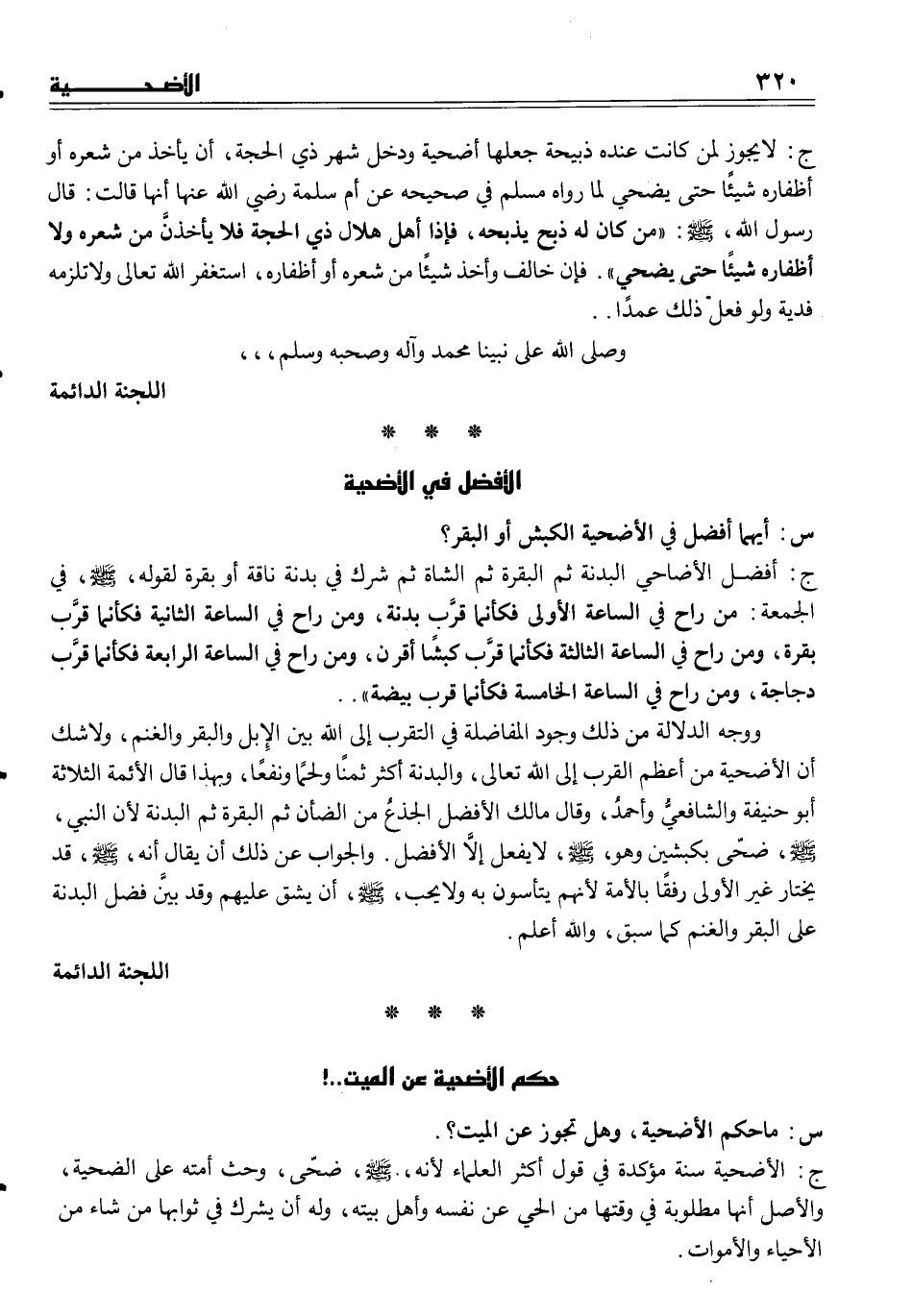 ج أفضل الأضاحي البدنة ثم البقرة ثم الشاة ثم شرك في بدنة ناقة أو بقرة لقوله، صلى الله عليه وسلم، في الجمعة من راح في الساعة الأولى فكأنما قرَّب بدنة، ومن راح في الساعة الثانية فكأنما قرَّب بقرة، ومن راح في الساعة الثالثة فكأنما قرَّب كبشاً أقرن، ومن راح في الساعة الرابعة فكأنما قرَّب دجاجة، ومن راح في الساعة الخامسة فكأنما قرب بيضة)) ..