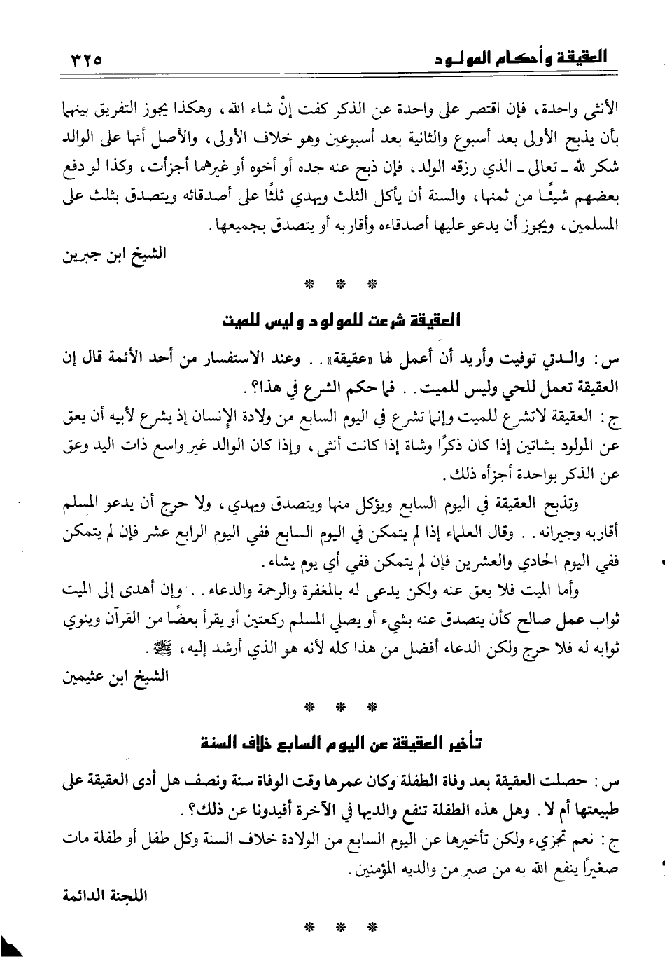 الأنثى واحدة، فإن اقتصر على واحدة عن الذكر كفت إنْ شاء الله، وهكذا يجوز التفريق بينهما بأن يذبح الأولى بعد أسبوع والثانية بعد أسبوعين وهو خلاف الأولى، والأصل أنها على الوالد شكر لله ــ تعالى ــ الذي رزقه الولد، فإن ذبح عنه جده أو أخوه أو غيرهما أجزأت، وكذا لو دفع بعضهم شيئاً من ثمنها، والسنة أن يأكل الثلث ويهدي ثلثاً على أصدقائه ويتصدق بثلث على المسلمين، ويجوز أن يدعو عليها أصدقاءه وأقاربه أو يتصدق بجميعها.