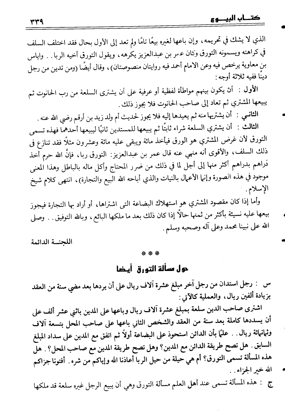 الثالث أن يشتري السلعة شراء ثابتاً ثم يبيعها للمستدين ثانياً ليبيعها أحدهما فهذه تسمى التورق لأن غرض المشتري هو الورق فيأخذ مائة ويبقى عليه مائة وعشرون مثلاً فقد تنازع في ذلك السلف، والأقوى أنه منهي عنه قال عمر بن عبد العزيز التورق ربا، فإنَّ الله حرم أخذ دَراهم بدراهم أكثر منها إلى أجل لما في ذلك من ضرر المحتاج وأكل ماله بالباطل وهذا المعنى موجود في هذه الصورة وإنما الأعمال بالنيات والذي أباحه الله البيع والتجارة) ، انتهى كلام شيخ الإسلام.