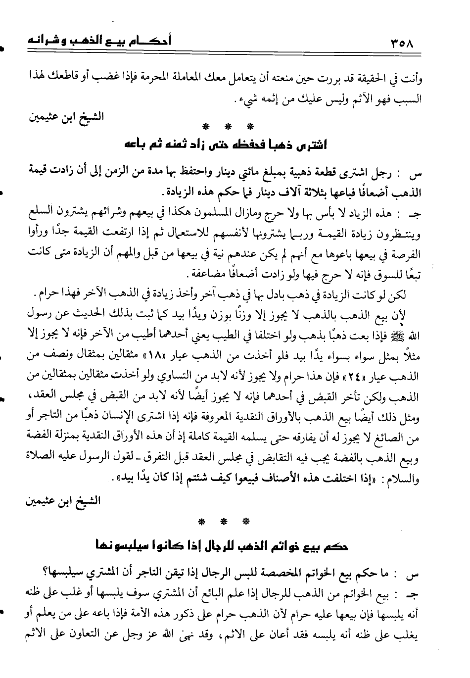 لأن بيع الذهب بالذهب لا يجوز إلا وزناً بوزن ويداً بيد كما ثبت بذلك الحديث عن رسول الله صلى الله عليه وسلم فإذا بعت ذهباً بذهب ولو اختلفا في الطيب يعني أحدهما أطيب من الآخر فإنه لا يجوز إلا مثلاً بمثل سواء بسواء يداً بيد فلو أخذت من الذهب عيار ((18)) مثقالين بمثقال ونصف من الذهب عيار ((24)) فإن هذا حرام ولا يجوز لأنه لابد من التساوي ولو أخذت مثقالين بمثقالين من الذهب ولكن تأخر القبض في أحدهما فإنه لا يجوز أيضاً لأنه لابد من القبض في مجلس العقد، ومثل ذلك أيضاً بيع الذهب بالأوراق النقدية المعروفة فإنه إذا اشترى الإنسان ذهباً من التاجر أو من الصائغ لا يجوز له أن يفارقه حتى يسلمه القيمة كاملة إذ أن هذه الأوراق النقدية بمنزلة الفضة وبيع الذهب بالفضة يجب فيه التقابض في مجلس العقد قبل التفرق ــ لقول الرسول عليه الصلاة والسلام ((إذا اختلفت هذه الأصناف فبيعوا كيف شئتم إذا كان يداً بيد)) .