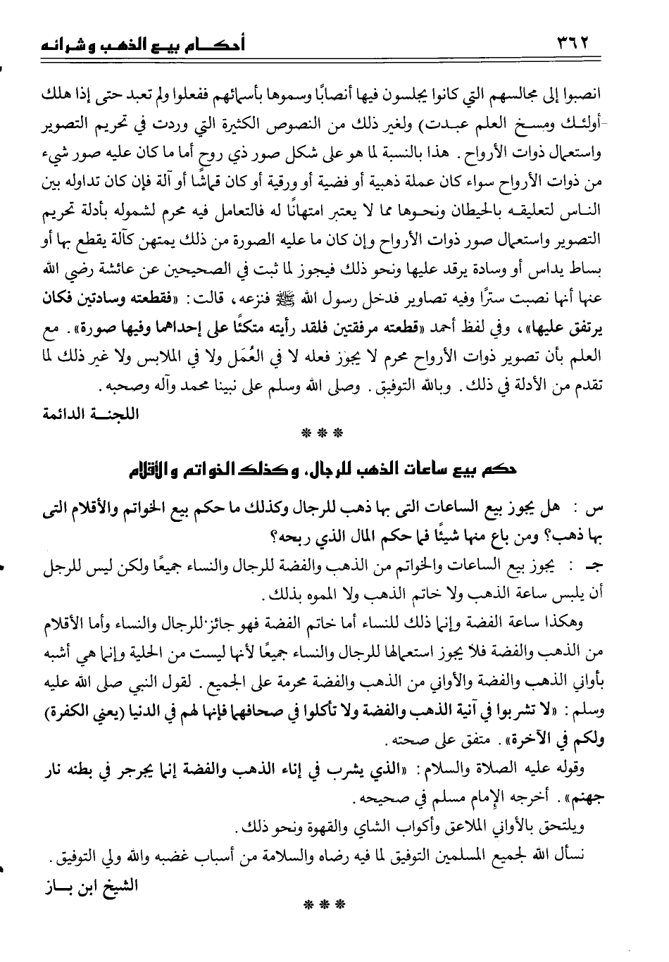 انصبوا إلى مجالسهم التي كانوا يجلسون فيها أنصاباً وسموها بأسمائهم ففعلوا ولم تعبد حتى إذا هلك أولئك ومسخ العلم عبدت) ولغير ذلك من النصوص الكثيرة التي وردت في تحريم التصوير واستعمال ذوات الأرواح. هذا بالنسبة لما هو على شكل صور ذي روح أما ما كان عليه صور شيء من ذوات الأرواح سواء كان عملة ذهبية أو فضية أو ورقية أو كان قماشاً أو آلة فإن كان تداوله بين الناس لتعليقه بالحيطان ونحوها مما لا يعتبر امتهاناً له فالتعامل فيه محرم لشموله بأدلة تحريم التصوير واستعمال صور ذوات الأرواح وإن كان ما عليه الصورة من ذلك يمتهن كآلة يقطع بها أو بساط يداس أو وسادة يرقد عليها ونحو ذلك فيجوز لما ثبت في الصحيحين عن عائشة رضي الله عنها أنها نصبت ستراً وفيه تصاوير فدخل رسول الله صلى الله عليه وسلم فنزعه، قالت ((فقطعته وسادتين فكان يرتفق عليها)) ، وفي لفظ أحمد ((قطعته مرفقتين فلقد رأيته متكئاً على إحداهما وفيها صورة)) . مع العلم بأن تصوير ذوات الأرواح محرم لا يجوز فعله لا في العُمَل ولا في الملابس ولا غير ذلك لما تقدم من الأدلة في ذلك. وبالله التوفيق. وصلى الله وسلم على نبينا محمد وآله وصحبه.